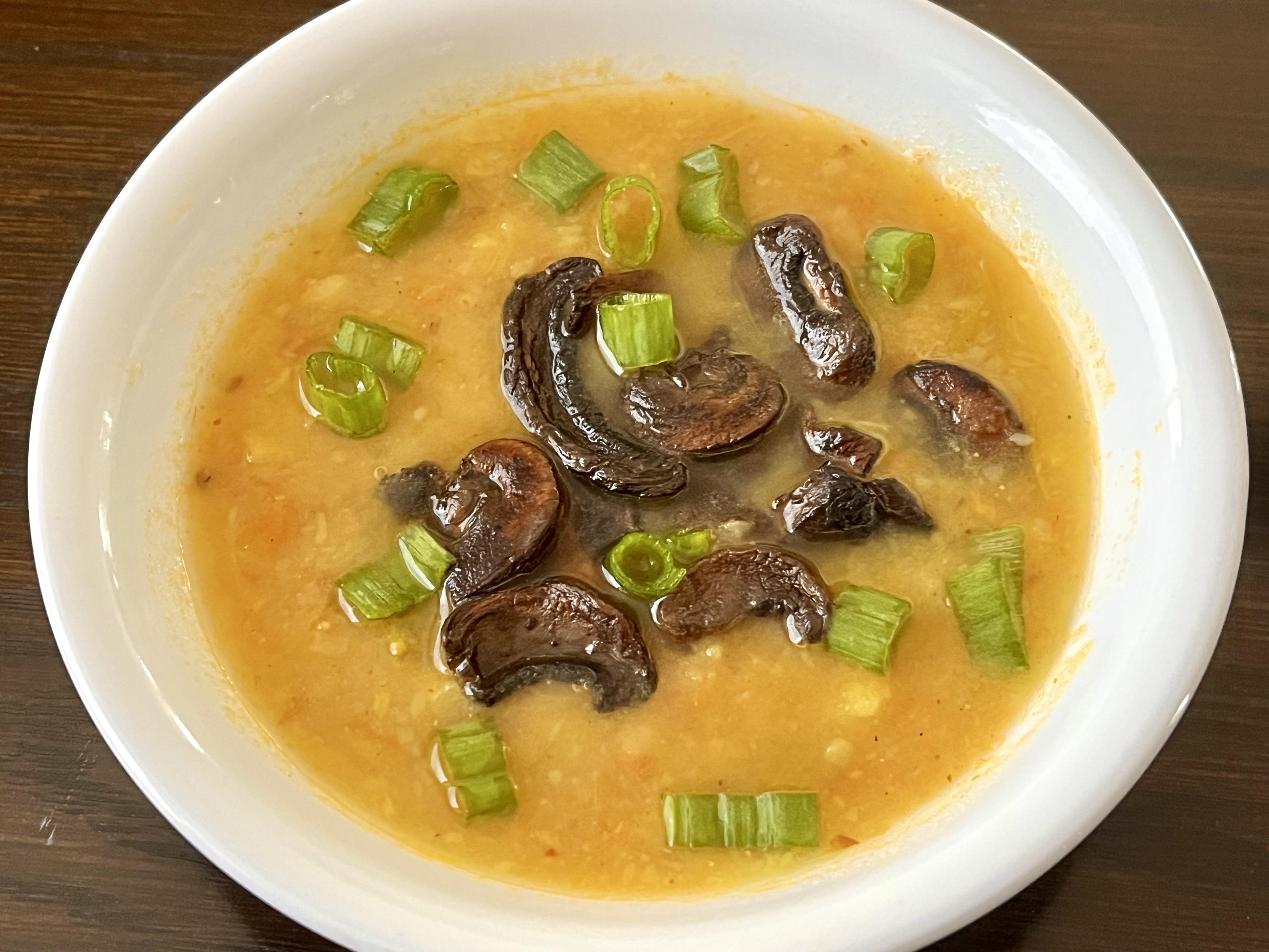 Step 4 – With a potato masher, mash everything coarsely so it’s partly smooth and partly chunky. Add vegetable stock, milk and spices. Let simmer for a couple of minutes. Check for salt and pepper. Mix in the roasted mushrooms and chopped scallions. Turn heat off. Garnish with chopped scallions. Enjoy!