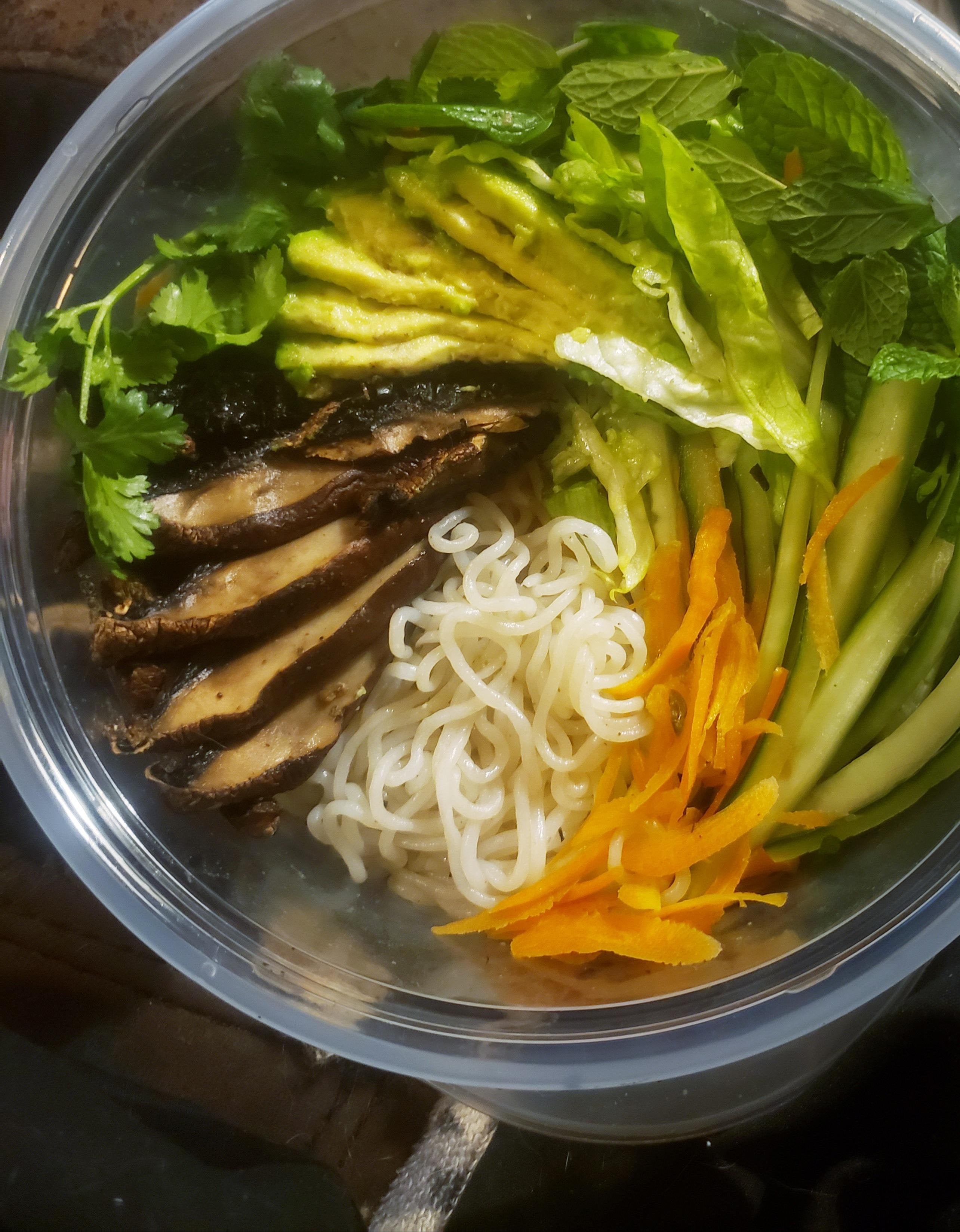 Ingredients- miracle noodles, spinach, mint,cilantro,carrot, cucumber, lettuce, 1/3 avocado, portobello mushroom steak(would honestly nix that in future preparations) . Sauce. House of Tsang Thai peanut sauce, Hoison sauce.