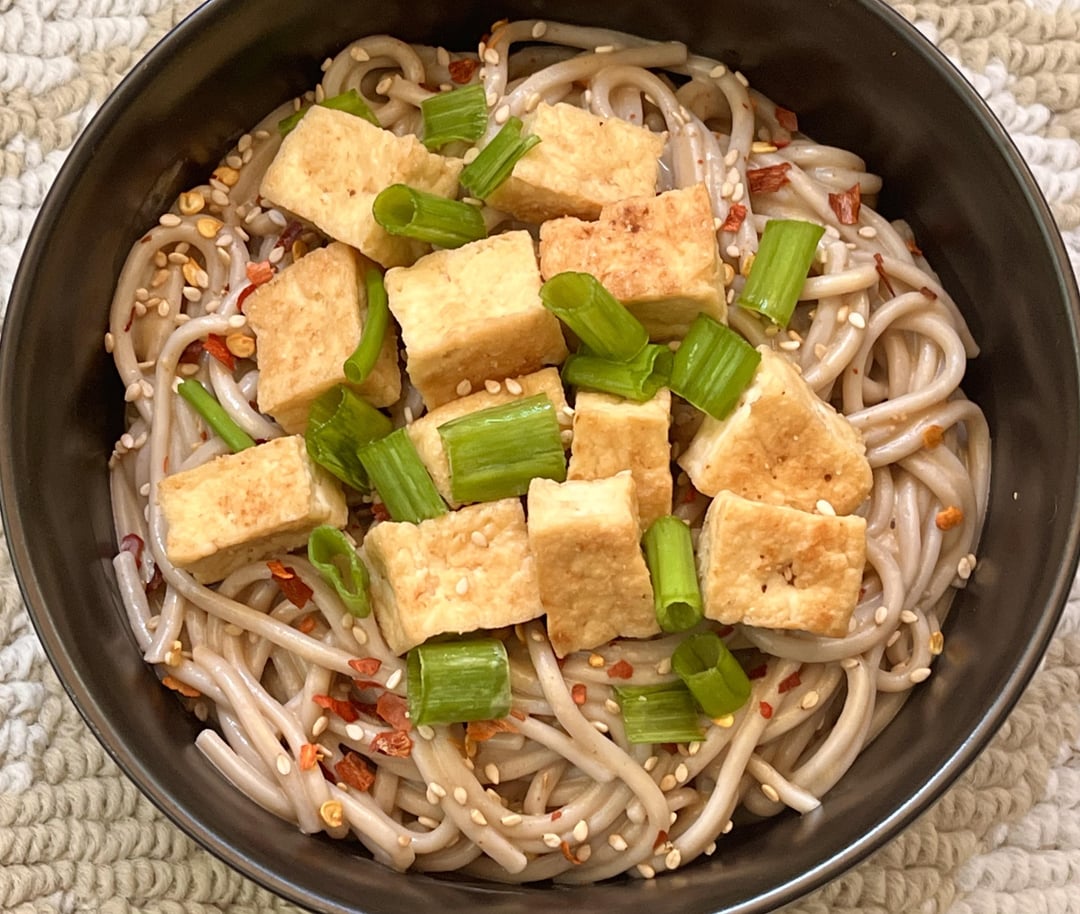 Step 4 (Garnish) – Serve Garlic Tofu over Soba noodles. Garnish with crushed red pepper flakes, Sesame seeds and chopped green scallions. Enjoy! 🙂