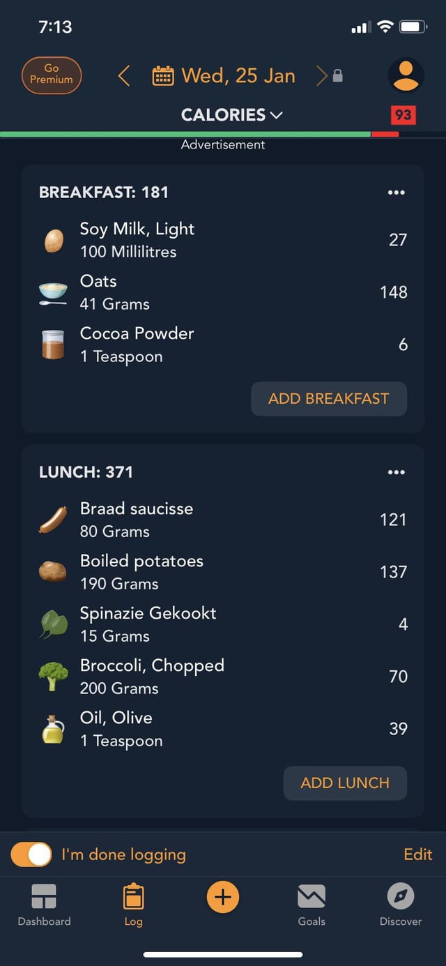 Lunch: veggie sausage, broccoli, mashed potato with spinach