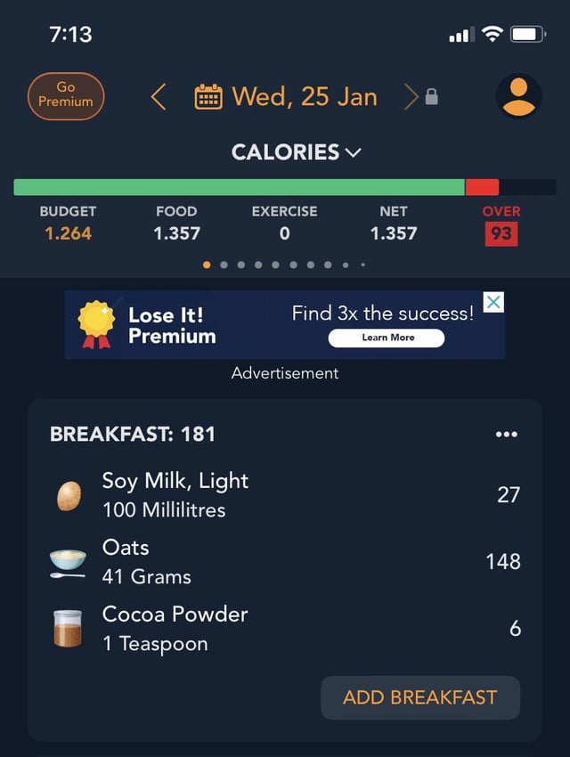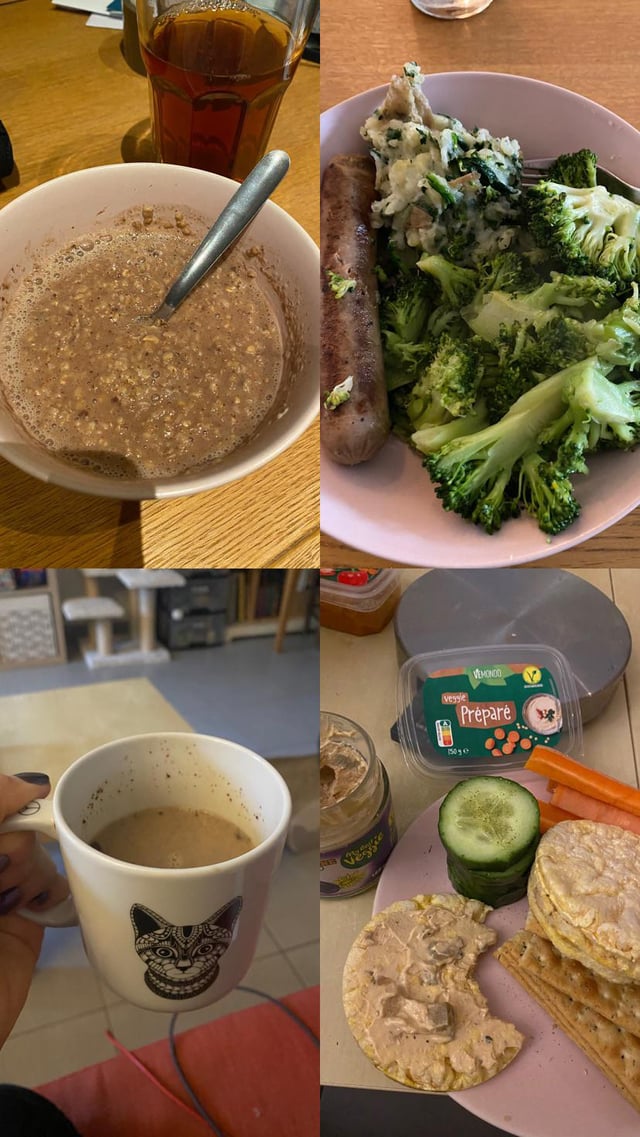 Breakfast: oatmeal with stevia and cocoa powder, glass of tea