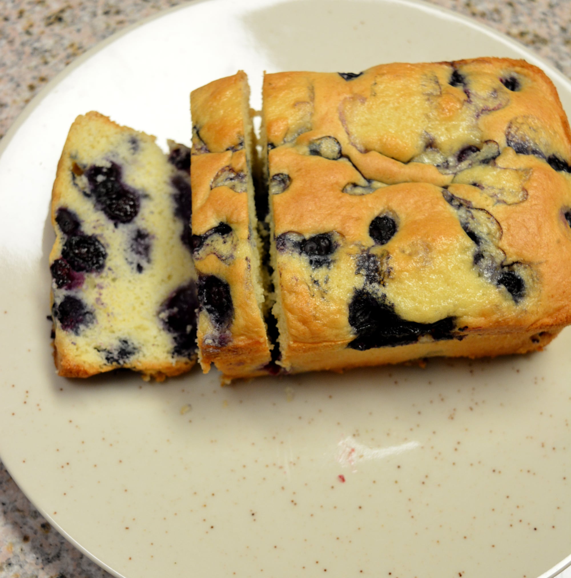 Mixed everything but blueberries and then fold them in last. Pour batter into two wilton 9 x 5 non-stick loaf pans (spray the pans first or line with parchment).