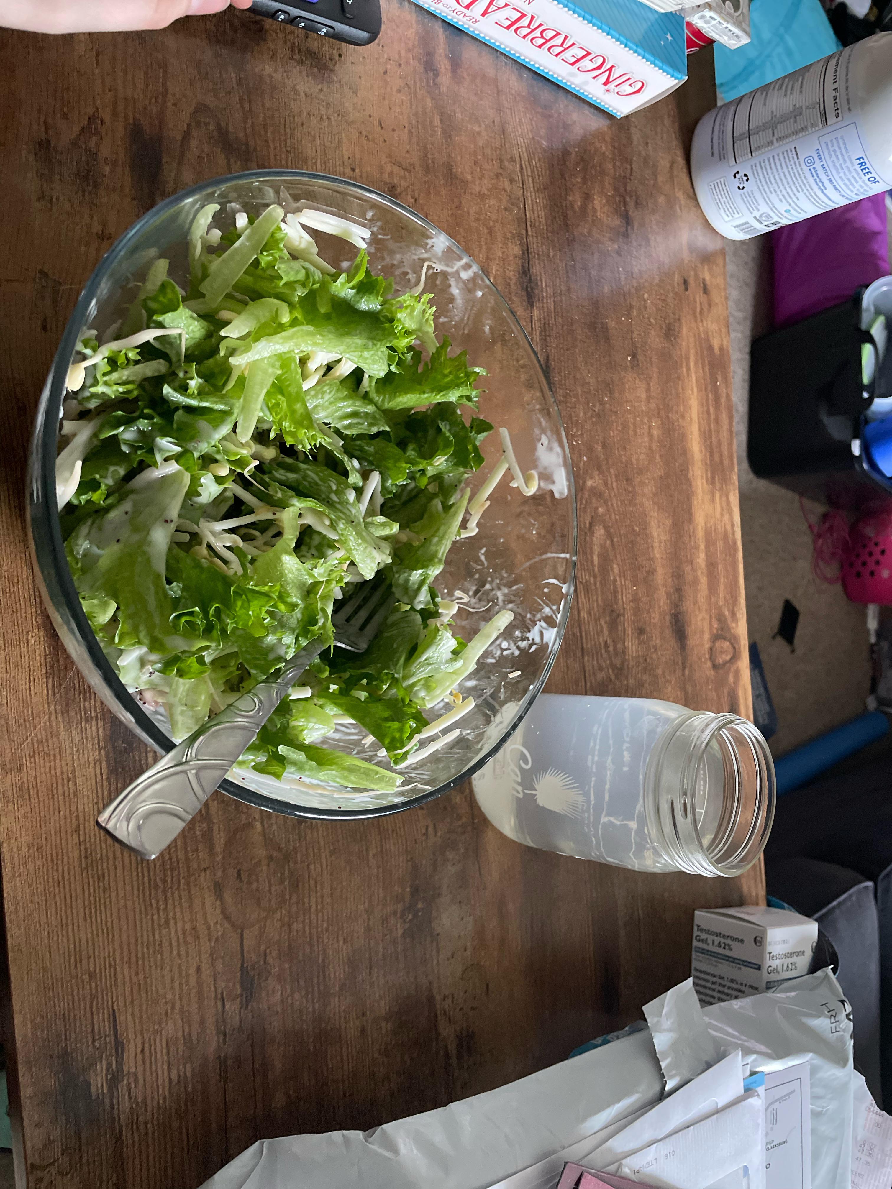 Home»1200 Calorie Vegan»giant salad(with mung bean sprouts, plant based cheese and poppyseed dressing) + coconut water/ a whopping 306 cal