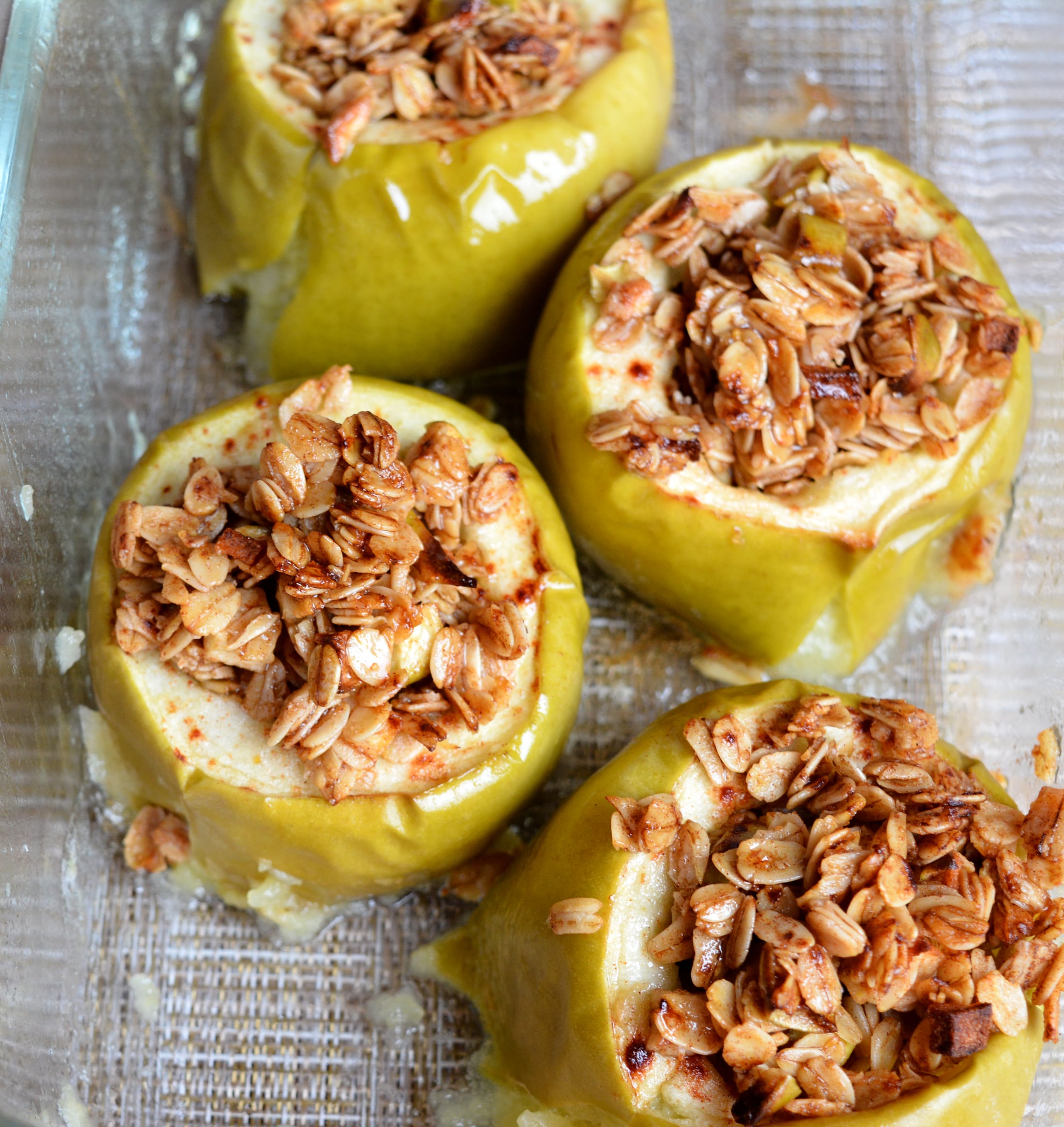 Core apples and save edible parts you remove. Chop up and add back in edible parts. Mix everything else together and add to apples. Spray with oil. Bake at 350 F for about 40 minutes. If you bake too long they will start to break open (still tasty!).