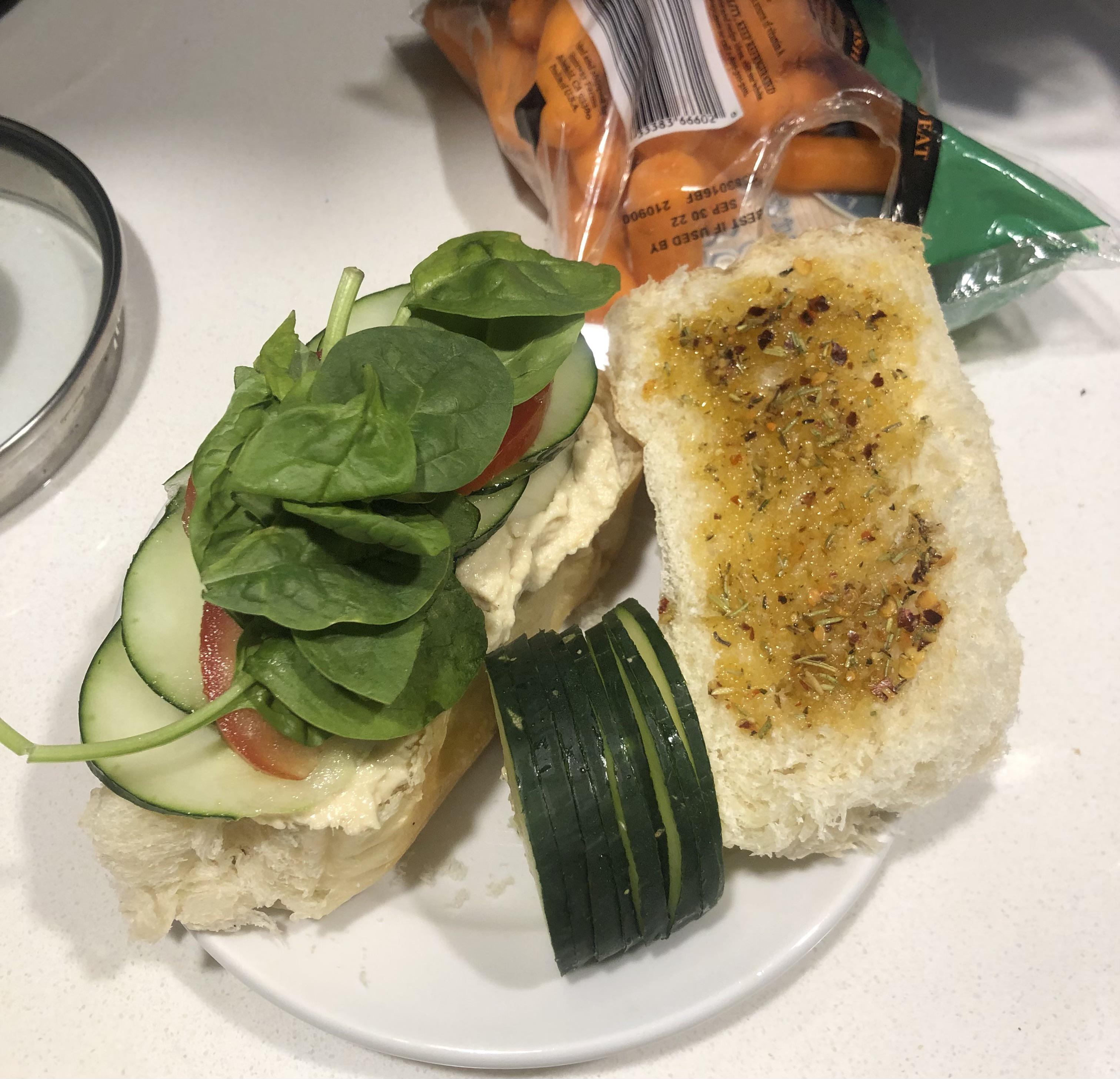 A thin layer on a tasty toasted slice of bread, with spinach, cucumber, tomato, and a little spread of hummus.