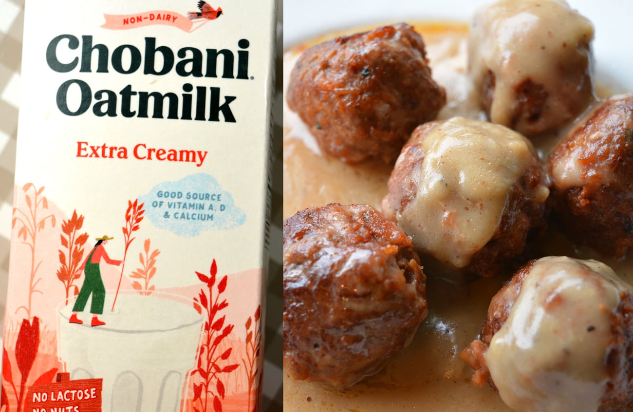 Every Swedish vegan meatball recipe I found has coconut milk in the sauce, so I tried replacing that with the new creamy Chobani oatmilk. Turned out so much better and lower calorie too. Sauce is 46 calories per 1/4 cup.