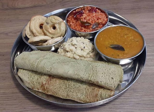 South Indian Veg Thali: Thakkali Sadam, Sambar, Pesarattu, Medu Vada