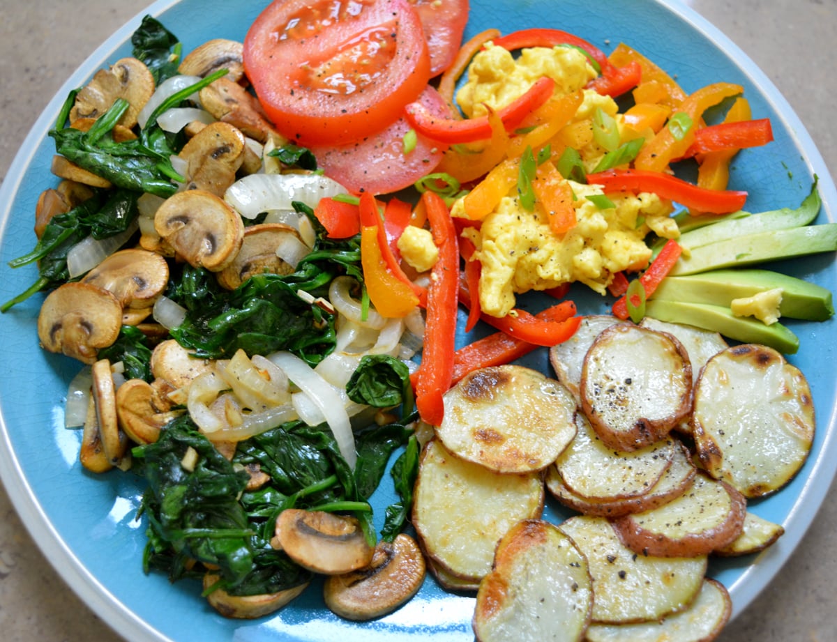 6 T Just Egg, 51 g onion, 148 g mushrooms, 75 g spinach, 91 g potatoes, 63 g tomatoes, bell pepper, avocado, spray oil