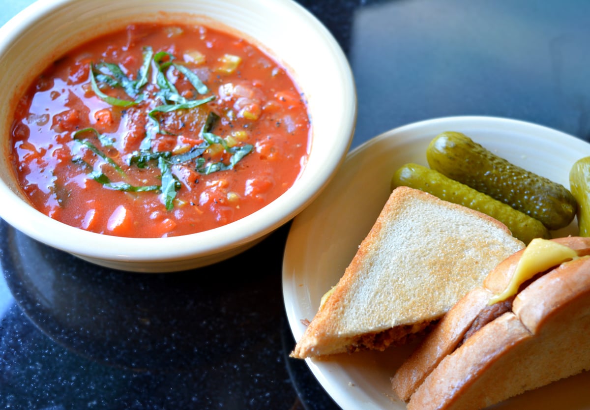 336 calories for everything: Violife Smoked Provolone Beyond Patty Melt + Basil Tomato Veggie Soup