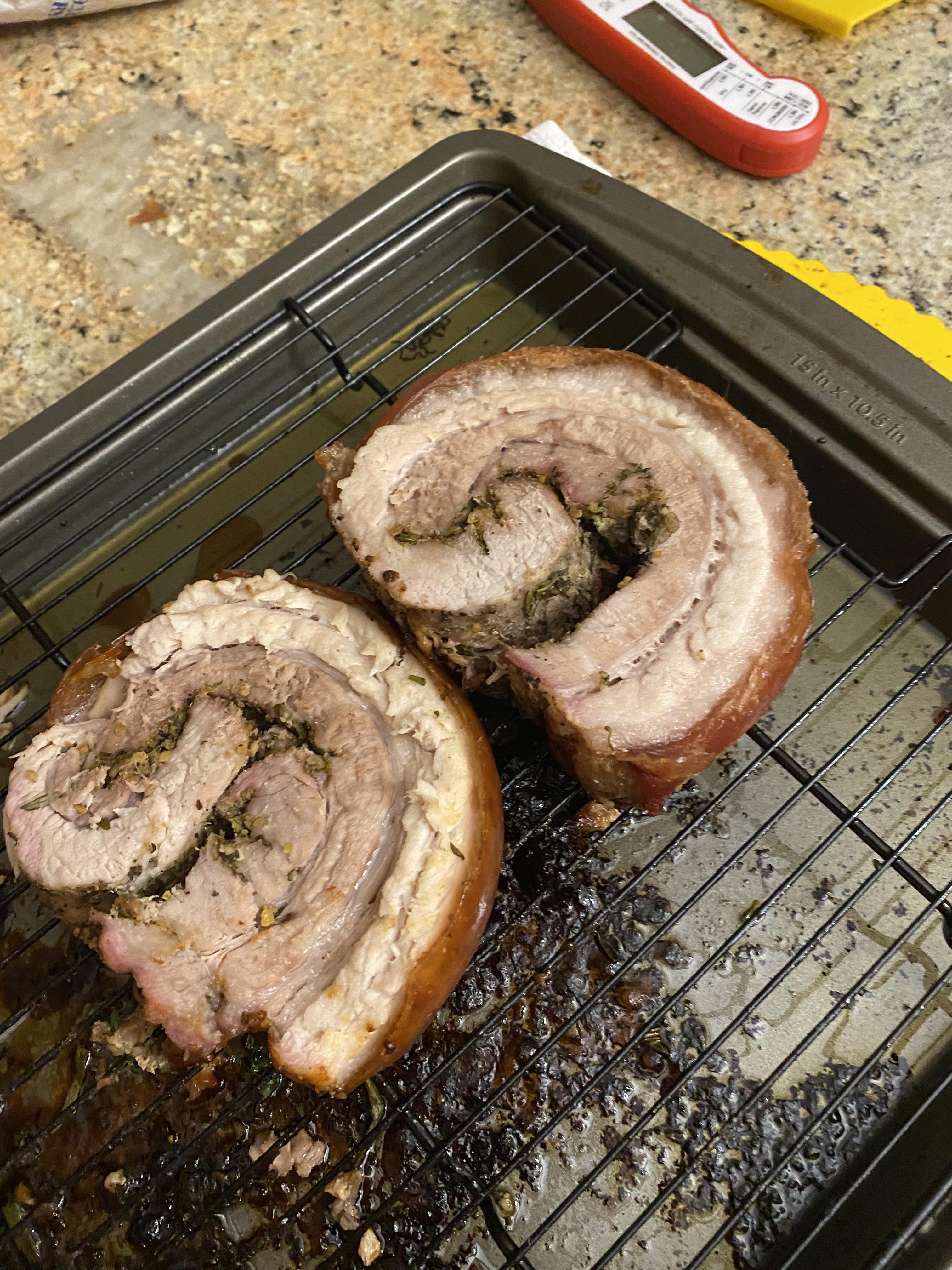 Pork belly with rind removed for inner portion. Did not score the skin or use baking soda. Seasoned, rolled, and tied last night, left in fridge overnight (dry brine?). 400 for one hour, 325 for two.