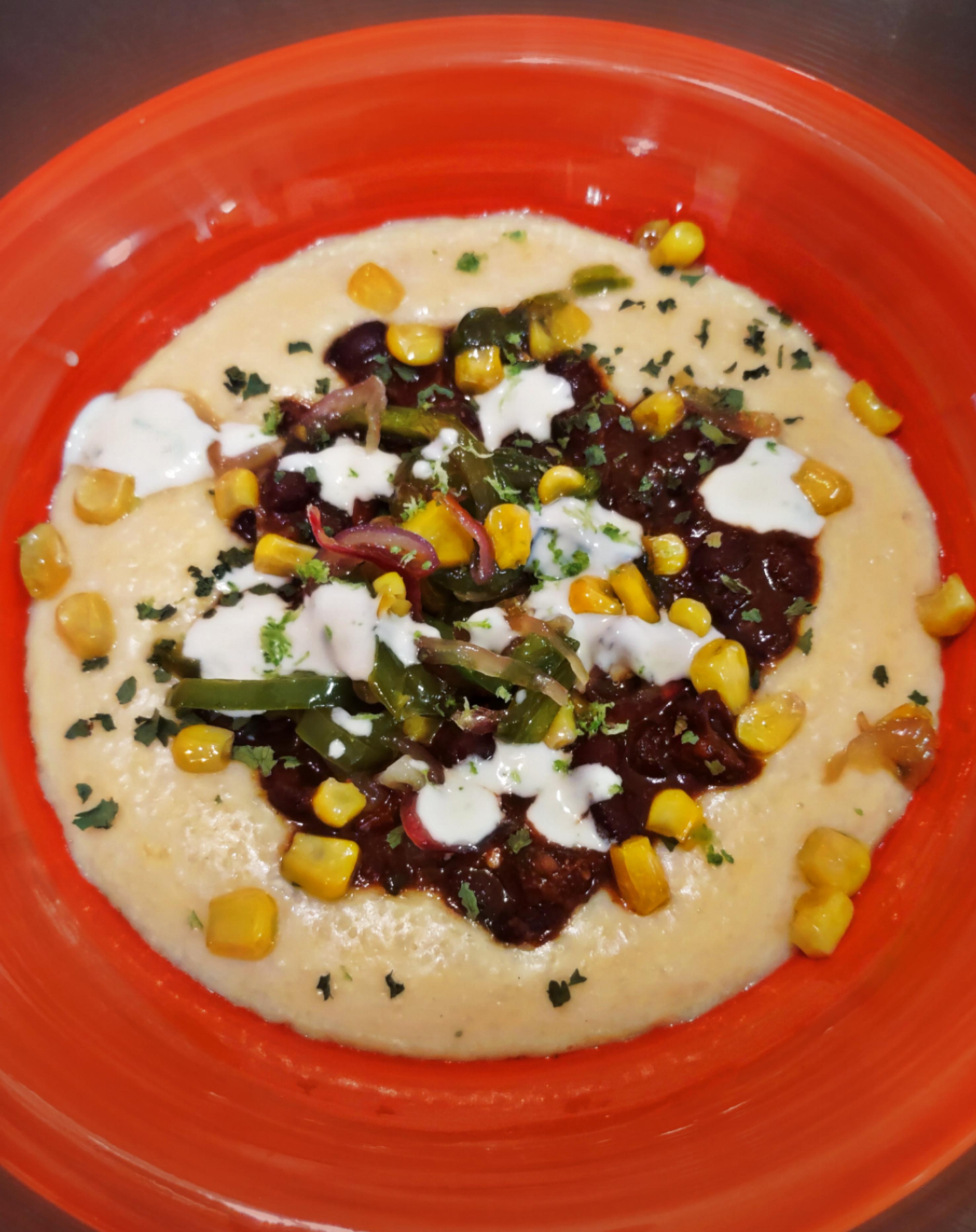 Add cheese grits to bowl, top with black beans, corn and pepper succotash and lime crema. Garnish with extra cilantro and lime zest.