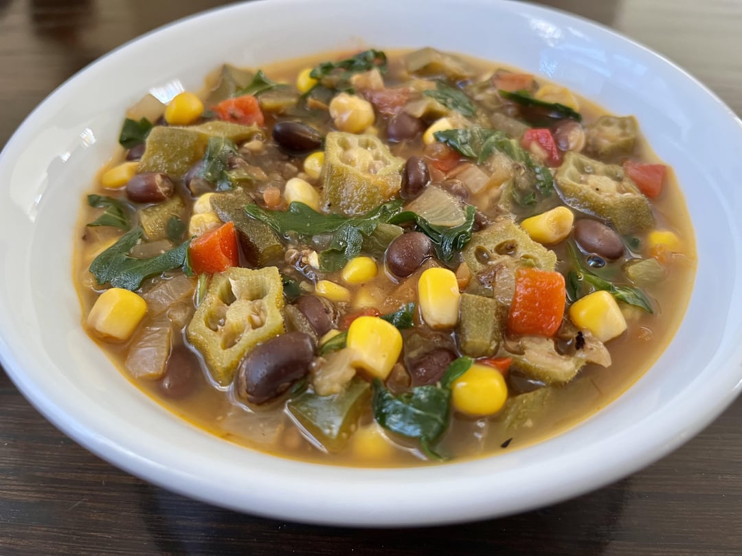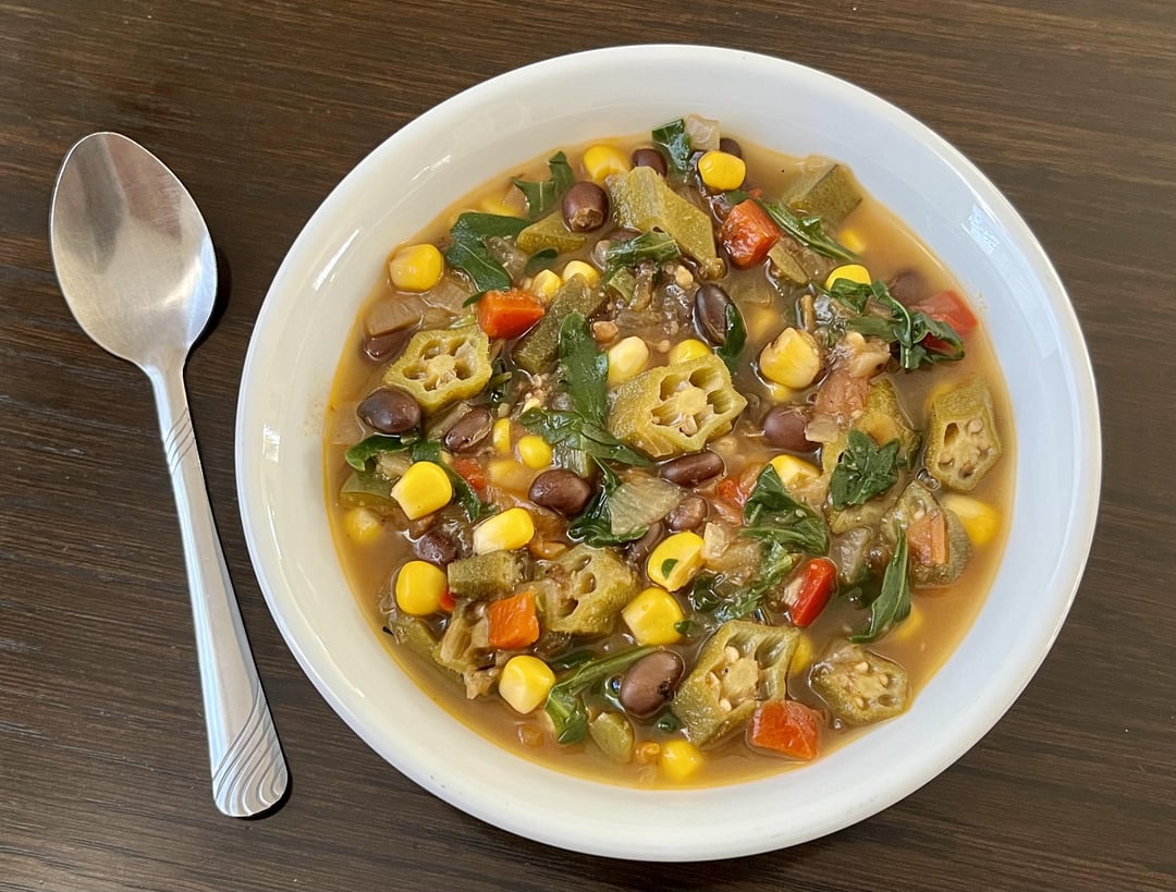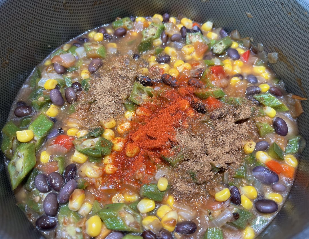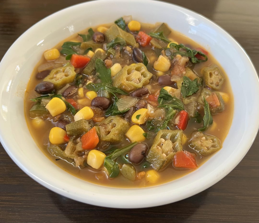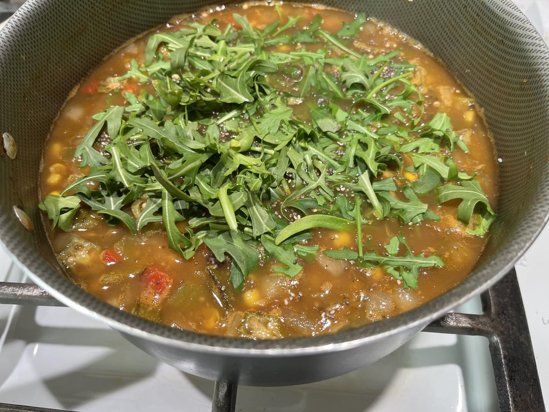 Veggie Stew with Okra, Black beans, Corn, Red peppers and Arugula.