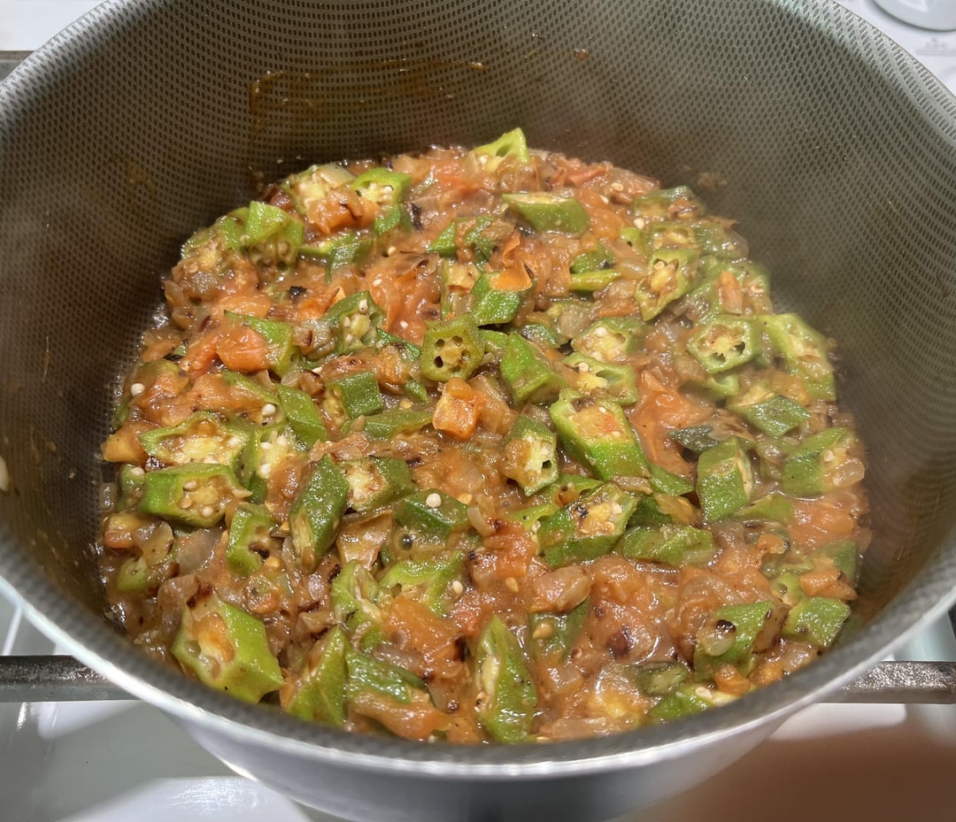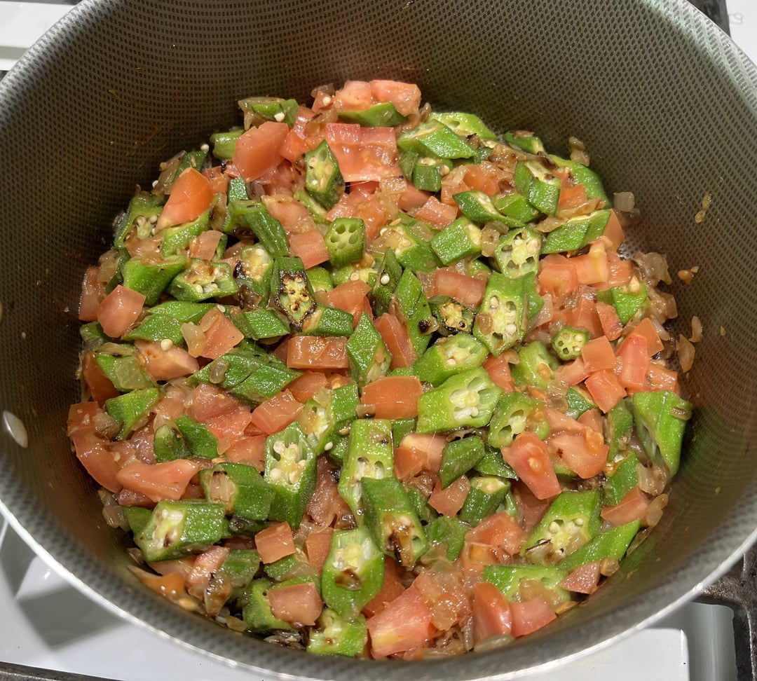Heat oil in a saucepan on medium heat. Sauté chopped onion until browned. Add chopped okra and minced garlic and sauté for about 10 mins. Add chopped tomatoes and let cook until it softens and gets mushy. Add the rest of the ingredients and let it simmer until all the veggies are cooked. Adjust the stock and salt and pepper in the end to your liking. Enjoy!!