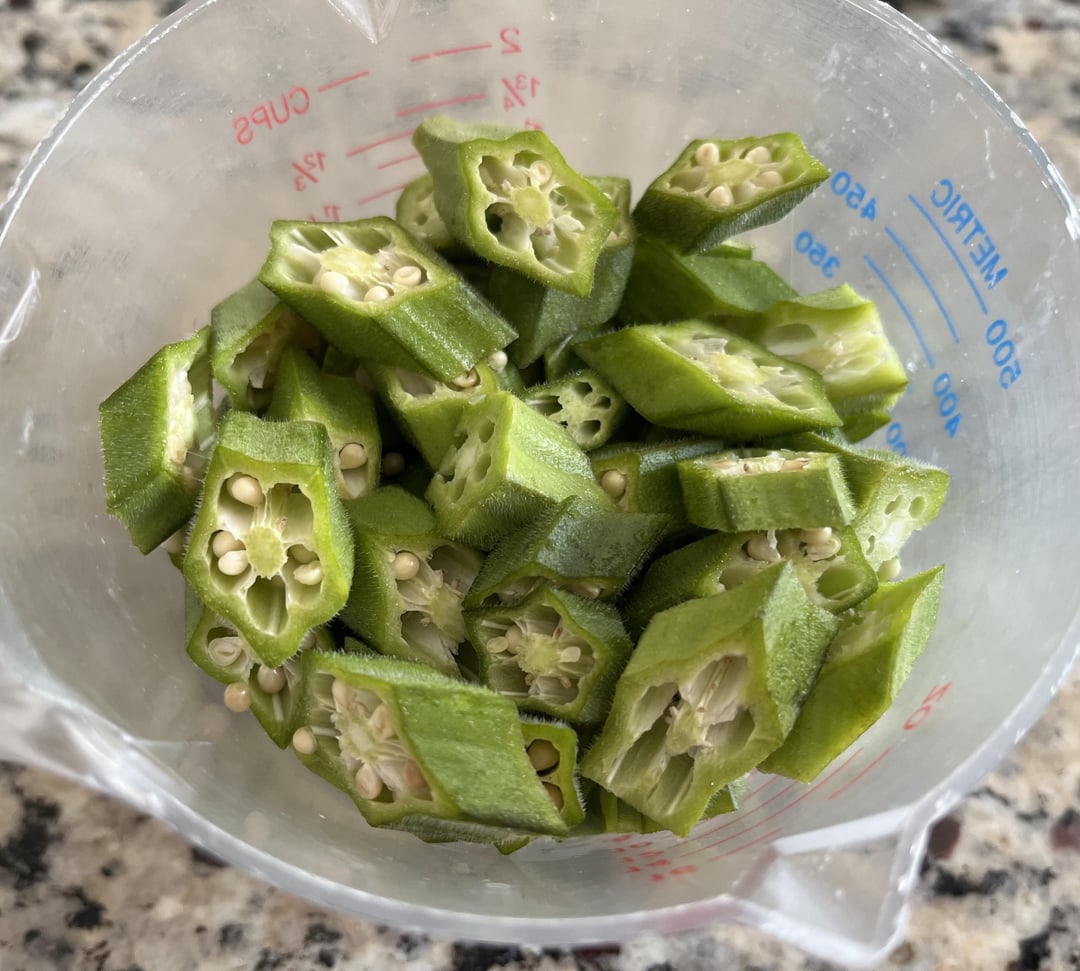Okra — fresh. Chopped into thick slices. 2 cups.