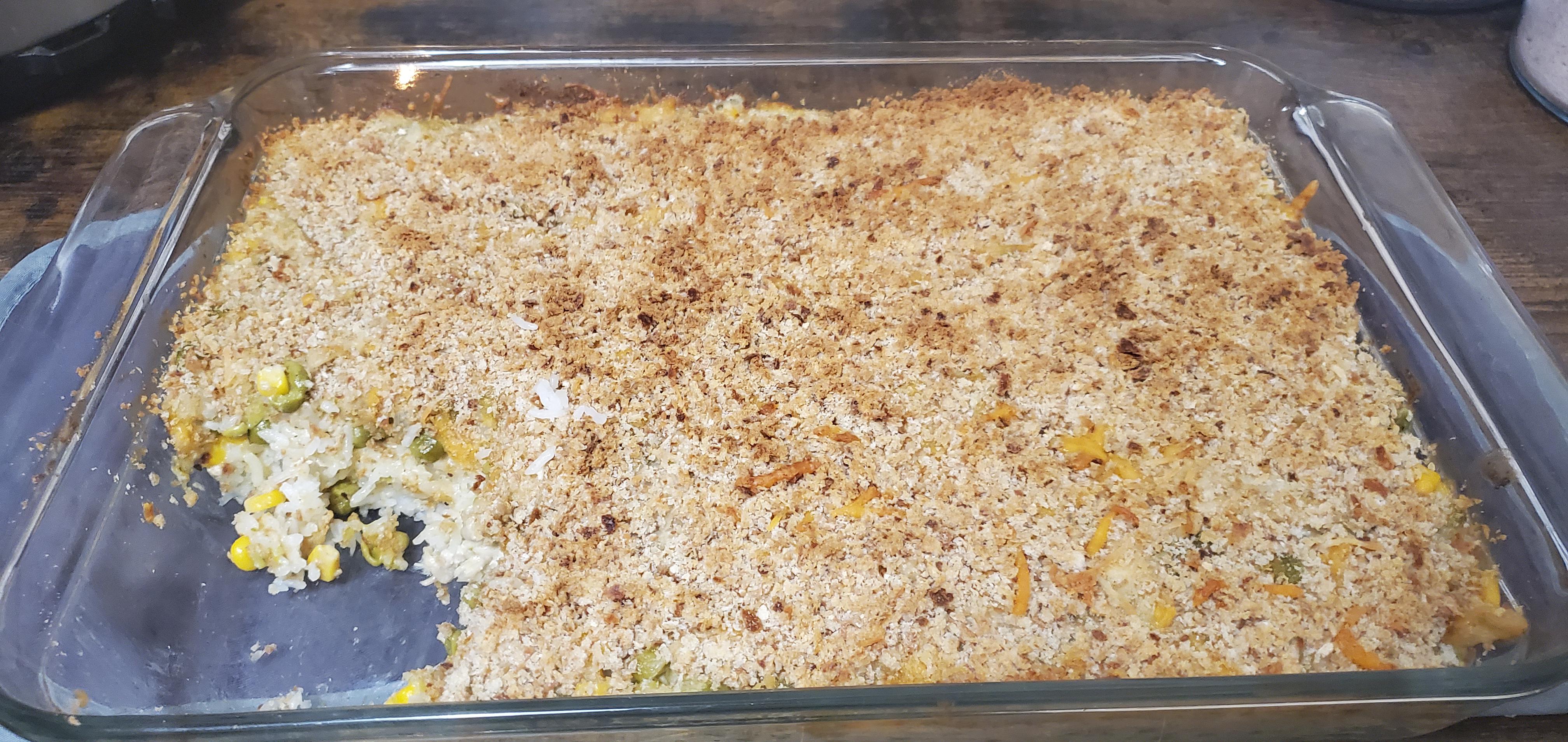 Creamy Garlic Herb Chicken Pot Pie on bed of Rice with Parmesan and Bread Crumb Crust