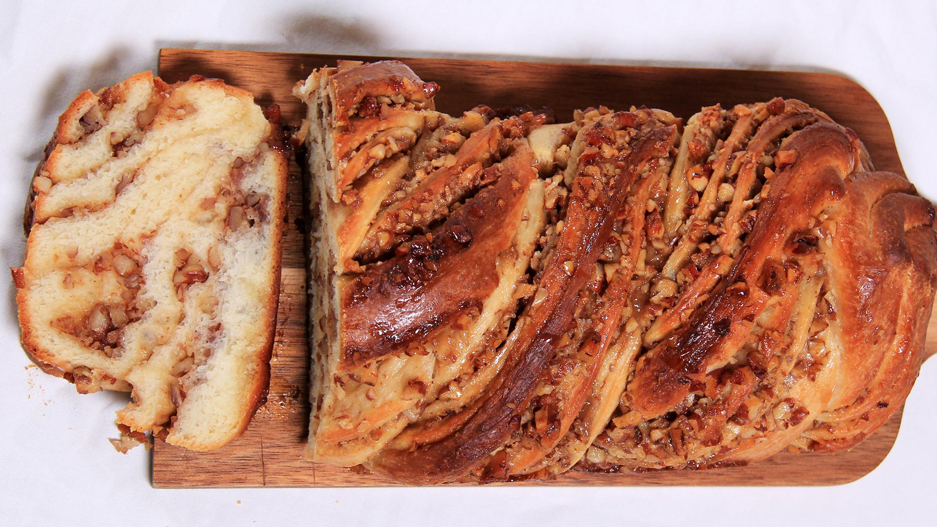 8. Generously butter 2 2lb. loaf pans. Once your dough rolls have chilled, take them out of the freezer and with a sharp knife, slice lengthwise down the centre of the dough, cutting it into 2 long pieces. Now for braiding! With the cut-sides facing upwards, start by overlapping one of the long strips over the centre of the other strip. Then lift the right half over the left half, followed by the left half over the right half. Repeat, twisting the dough to make a two-stranded plait.
