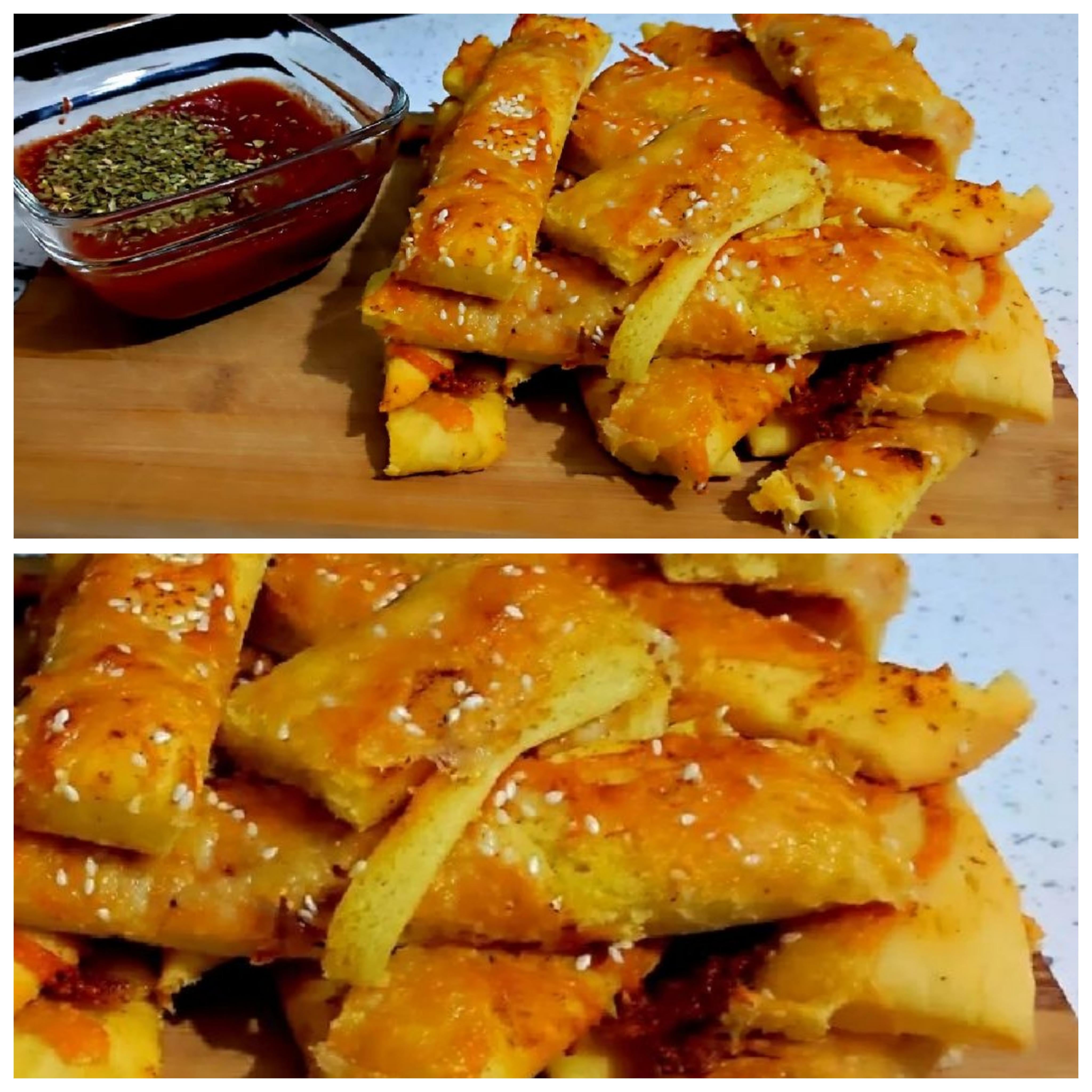 Then we cut the three woven pieces into thin strips. After we have finished cutting, we take melted butter and coat them, then we salt them with the mix of spices and put them on the grill for 10 min. After 10 minutes, take them out and add cheddar cheese and sesame seeds, return them to baking for another 5 minutes. After 5 minutes, we take them out and they are ready