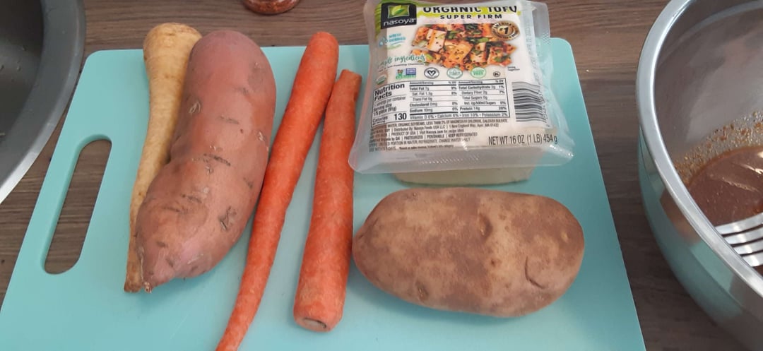 Set your oven to 350F so it can preheat while you prep. Cut **Group 1** into 1-inch cubes. I peel all the veggies, except for the potato, as I like the skins. Just give it a good wash and scrub! In a large mixing bowl, mix **Group 2** into a paste. Add **Group 1** and make sure everything is coated well. Add the mix into a large baking pan. Don’t worry about oiling the pan, the mix already has plenty. Bake at 350F for 30 minutes (my oven heats unevenly, so in the middle of this step, also rotate the pan 180 degrees. Remove from oven, toss the veggies, then return to the oven for 15 minutes. Once done, sprinkle **Group 3** and serve hot!