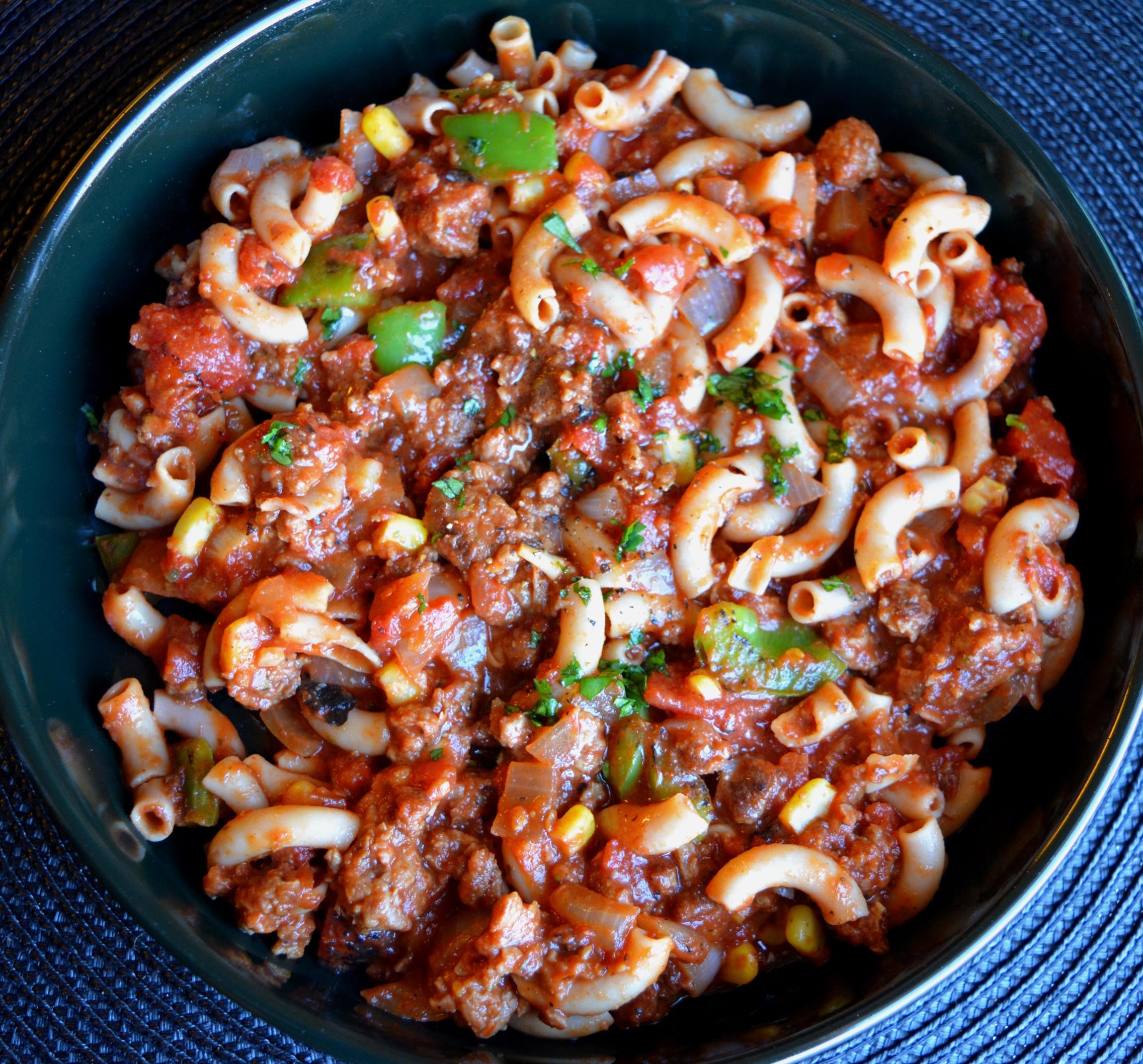 I veganized and further modified the Budget Bytes version of American Goulash. My changes – added paprika, corn, Beyond meat instead of beef, Used “No beef” broth instead of water. No pour oil. Less red wine.