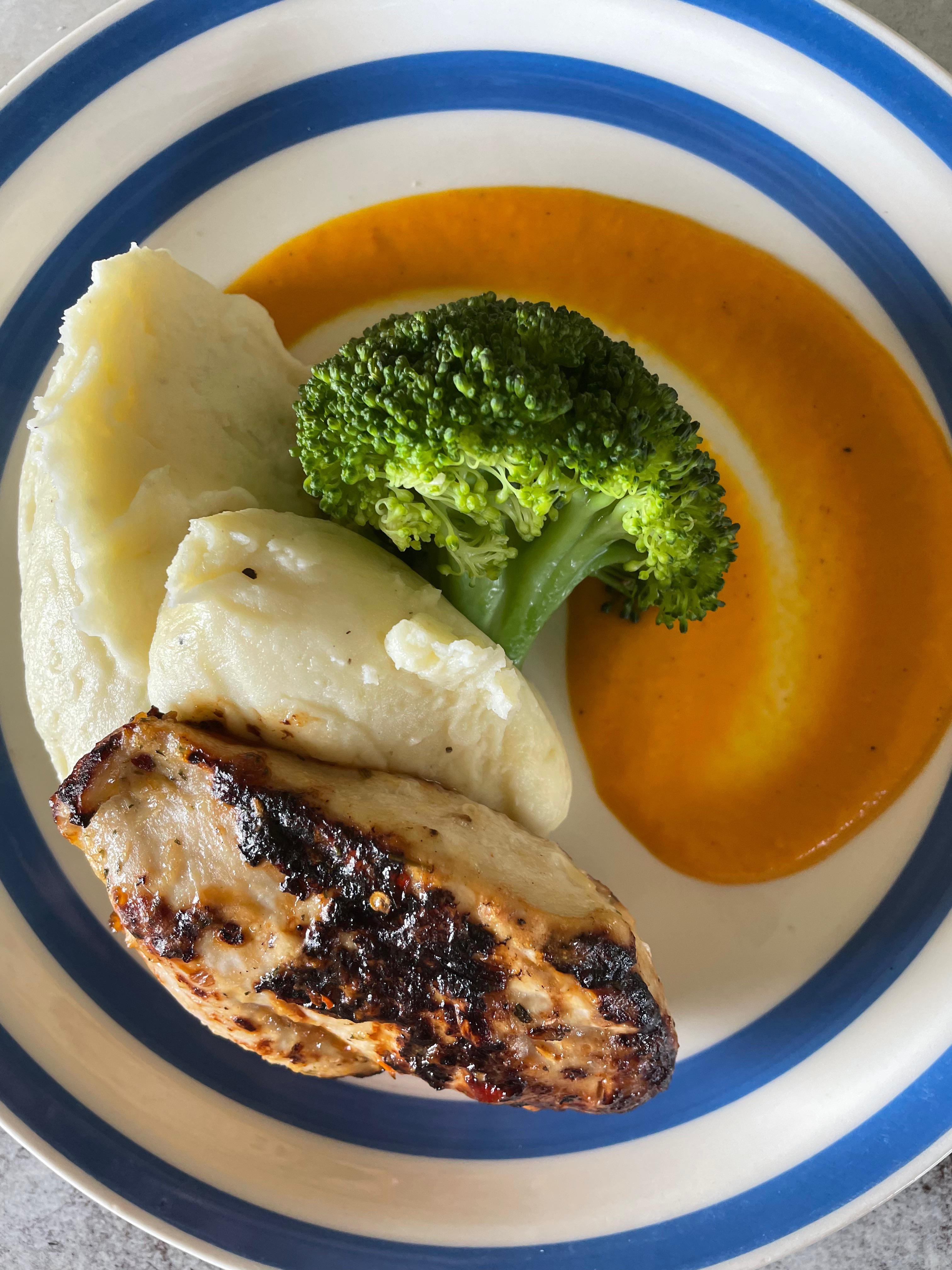 Mayo marinated Chicken, mashed potato, broccoli and a carrot and red pepper purée. by Obvious-Cow-6130 Culinary Culinary Porn