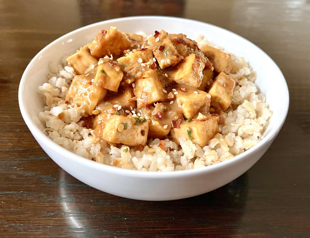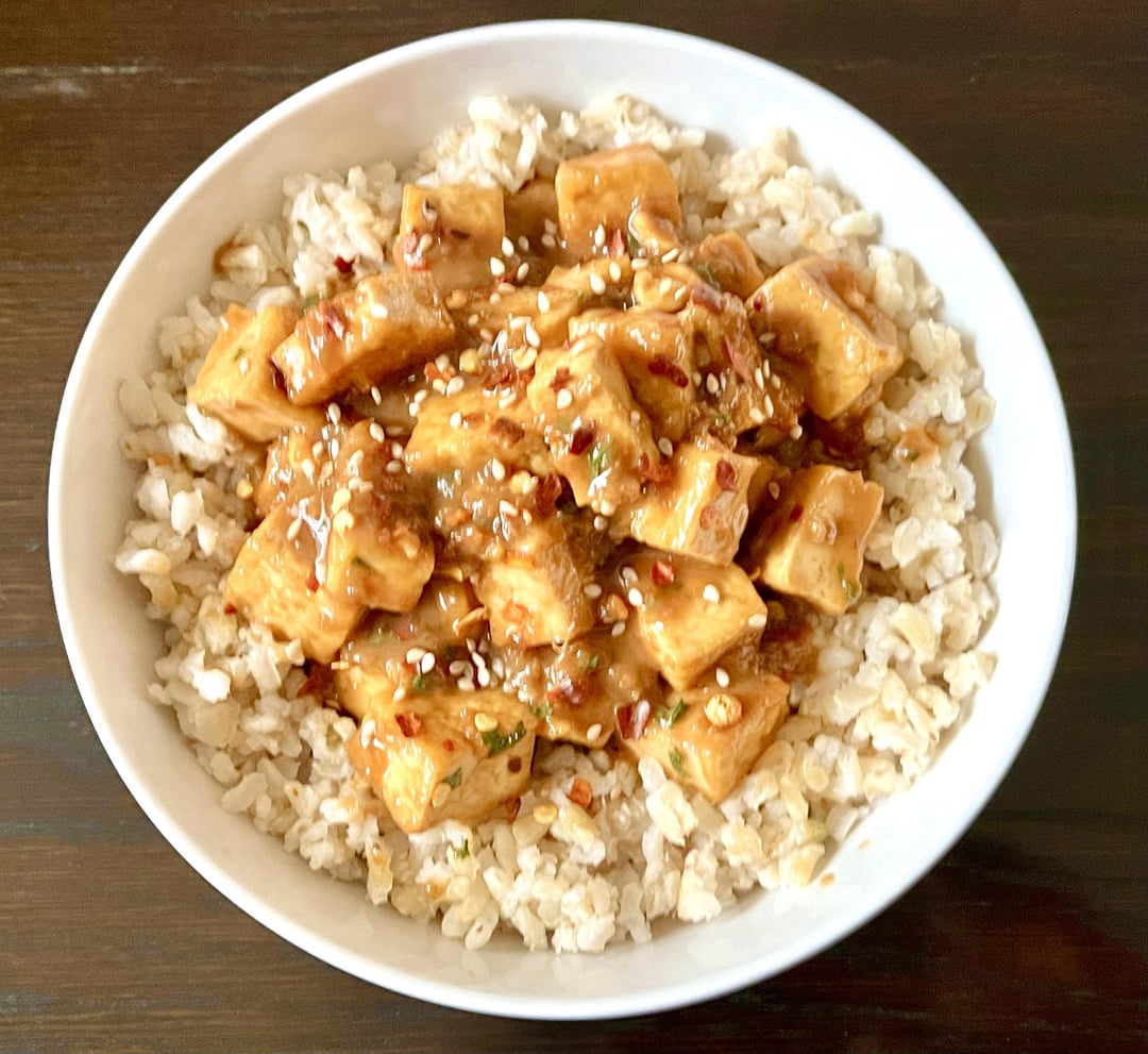 Ingredients: Jasmine Brown rice – 1 cup, Tofu – firm kind one block, Peanut butter – 2 tablespoons, Low sodium soy sauce – 3 tablespoons, lemon juice – 1 tablespoon, 100% pure Maple syrup – 2 tablespoons, toasted sesame oil – 2 teaspoons, finely minced ginger root – 1 tablespoon, crushed red pepper flakes, ground black pepper to taste.