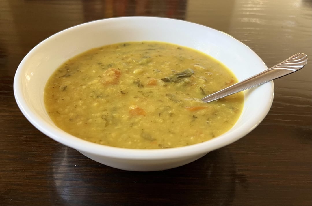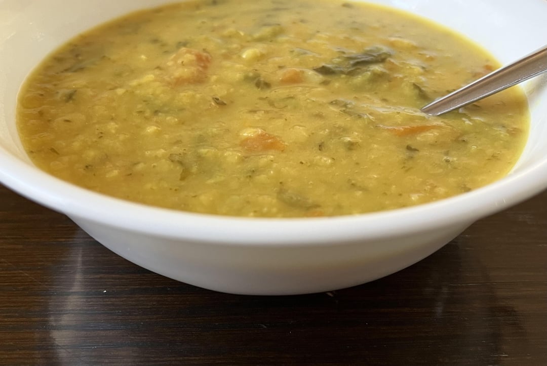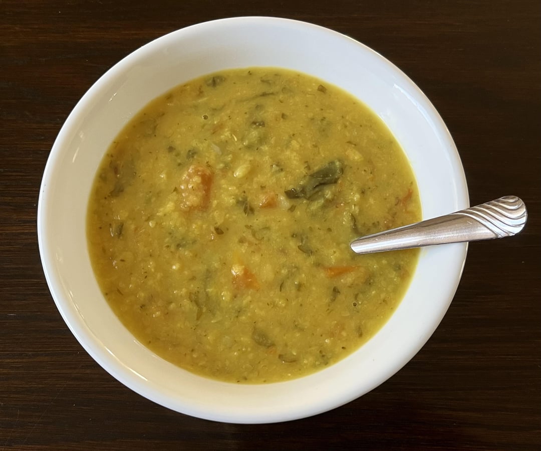 I put all the above ingredients except vegetable stock in the pressure cooker. Pour some water just enough to submerge them. Make sure they don’t completely drown, that’s too much water. Give it a stir, close the lid tightly with the vent-weight on top (traditional pressure cooker comes with a vent weight). Turn the heat on to medium. In just about 5 mins, the pressure inside builds and you’ll hear the pressure whistles go off. I turn the heat off after 5 whistles. Wait at least 15 minutes to open the lid because the contents inside will still continue to cook under pressure for a while due to the residual heat. Then, open the lid and you’d notice that all the contents inside are thoroughly cooked. With a big spoon, mash it up. Add vegetable stock and stir the whole thing evenly. Depending on how thick/thin you want your soup, adjust stock accordingly. Also adjust salt and pepper to taste. Enjoy!