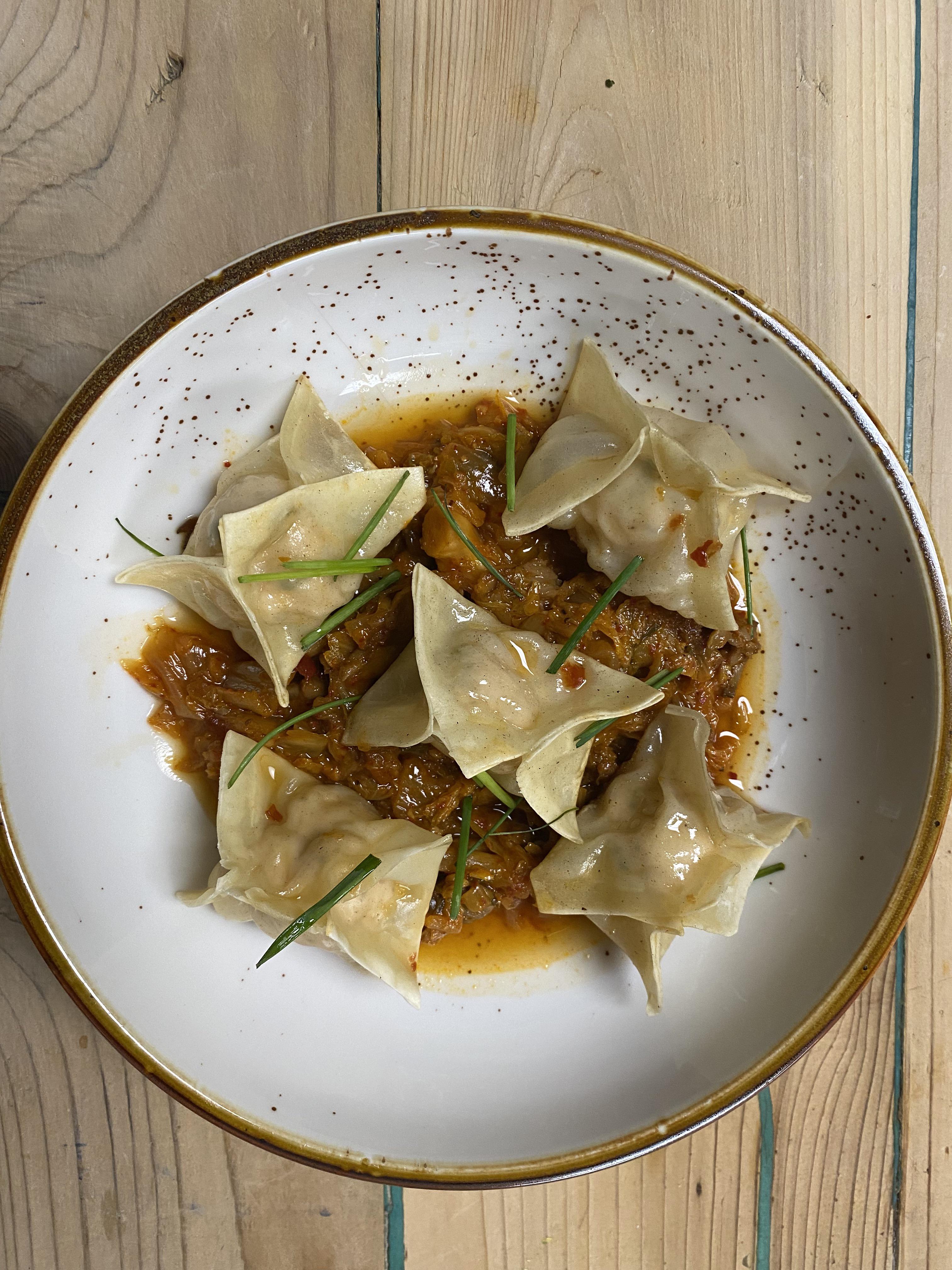 Seafood dumplings (shrimp, salmon, & calamari) filling with a Korean bbq sauce made in house kimchi by [deleted] Culinary Culinary Porn