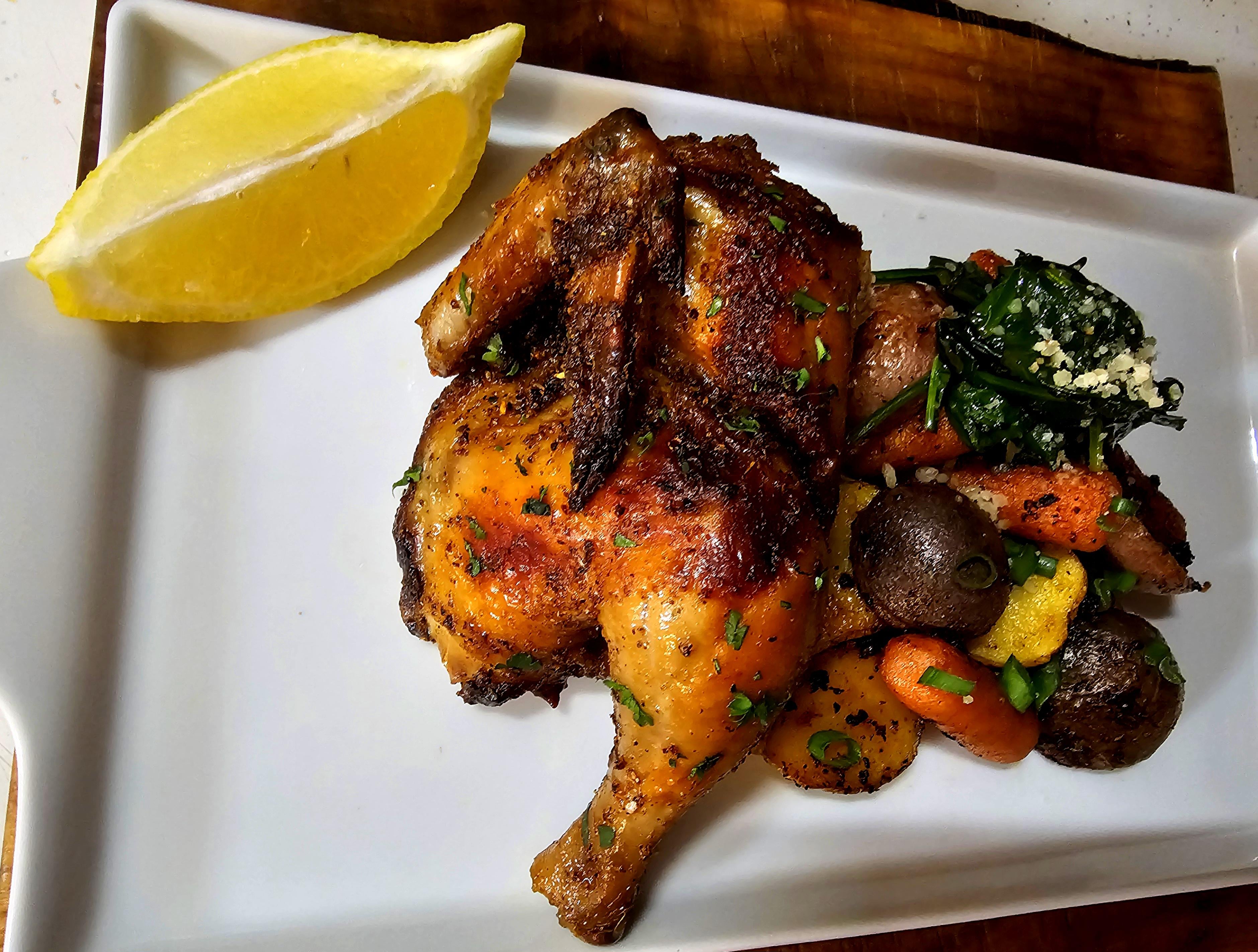 Cornish Hen, Roasted Potatoes & Carrots, Sautéed Spinach