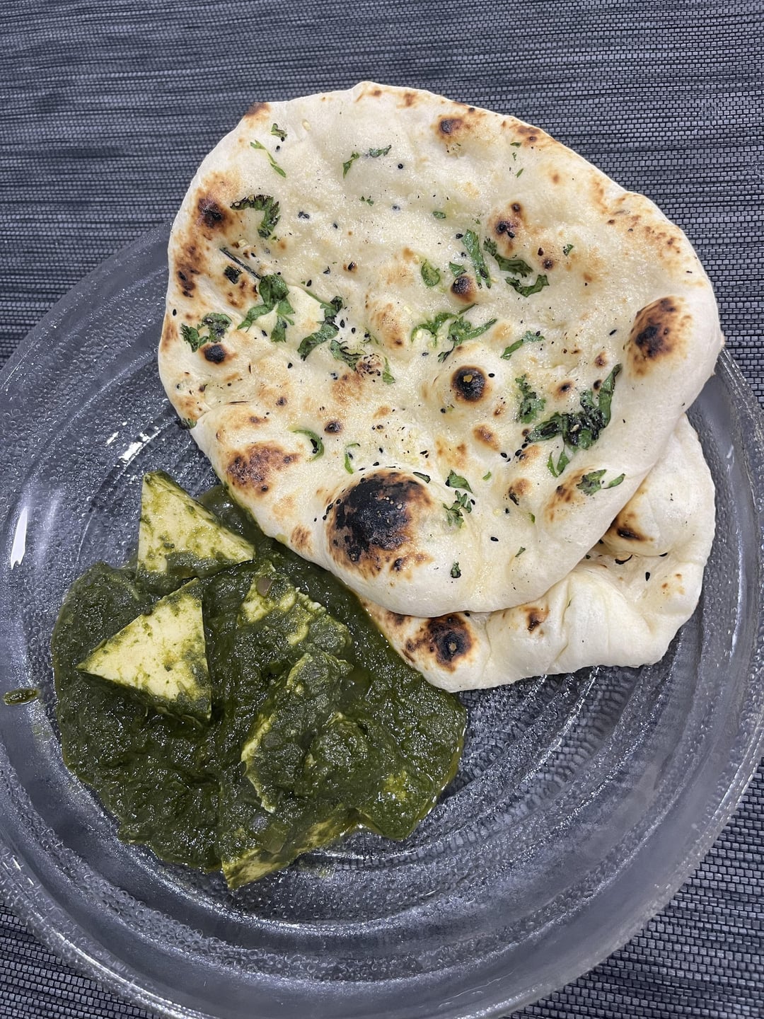 Pick the pan up by the handle (use an oven glove if it’s very hot) and flip the pan upside down to cook the naan directly over the flame. The water will ensure the naan sticks to the pan. Cook until charred spots appear all over the surface of the naan.