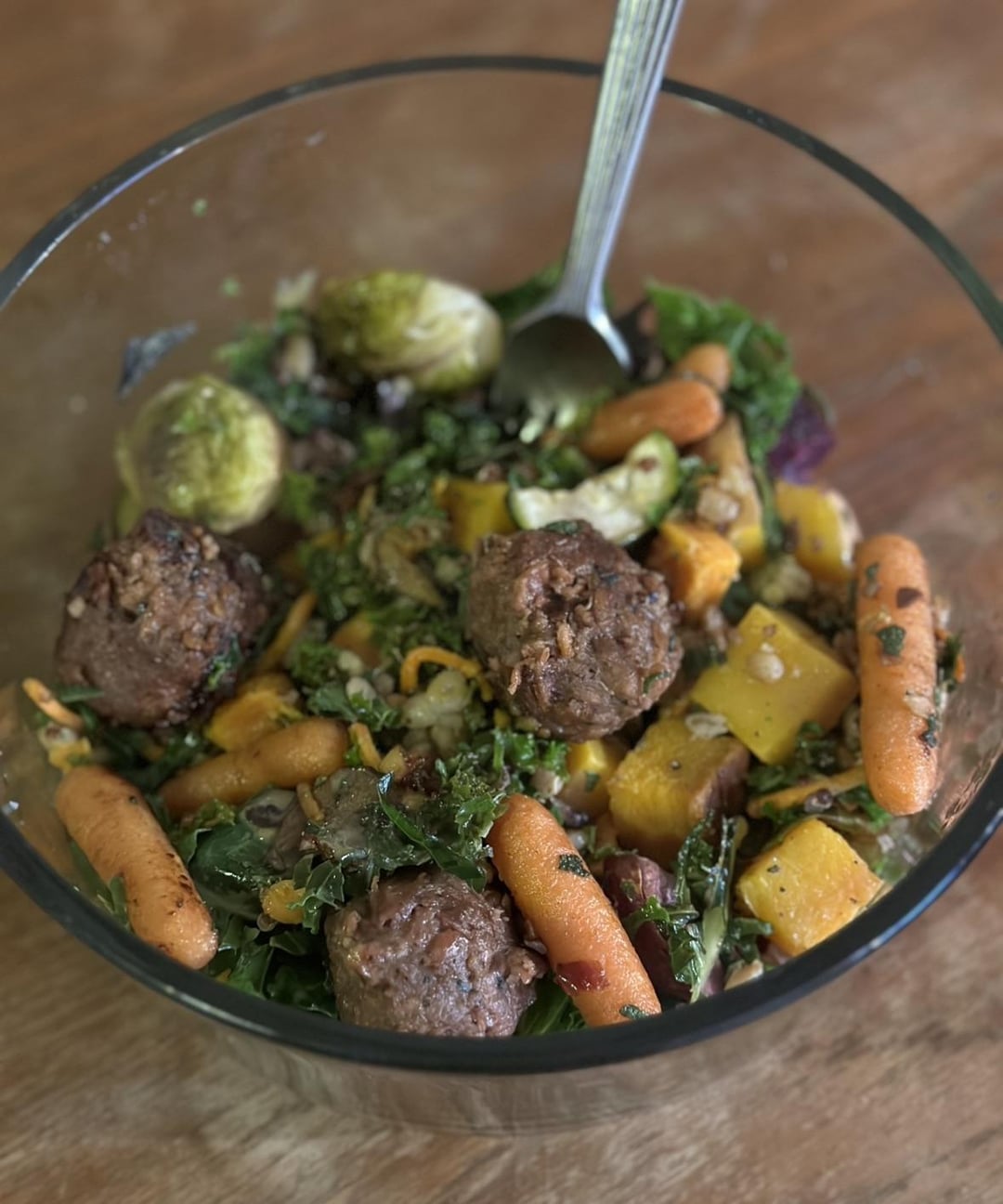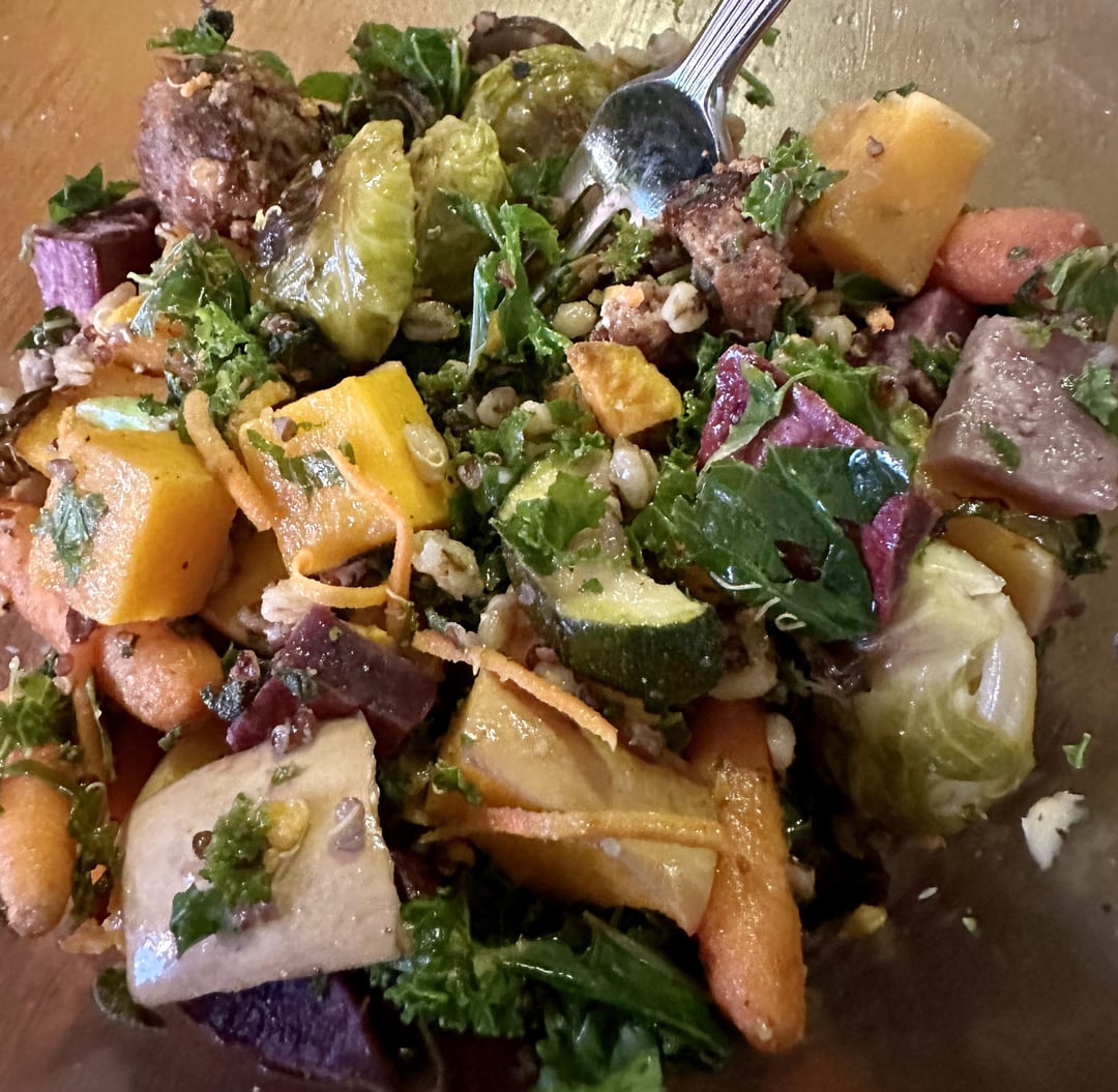 Just throwing together a few things in my fridge … batch prepped roasted veggies, a leftover vegan kale Caesar salad, and some leftover beyond meatballs for protein. This large mixing bowl is 2 servings,