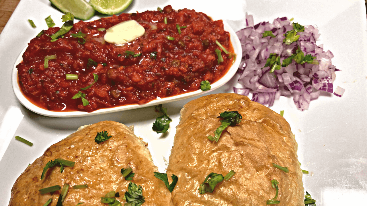 Pav bhaji is a flavorsome and hearty meal that has a delicious blend of spicy mixed vegetables, served alongside soft butter toasted dinner rolls, crunchy onions and lemon wedges.