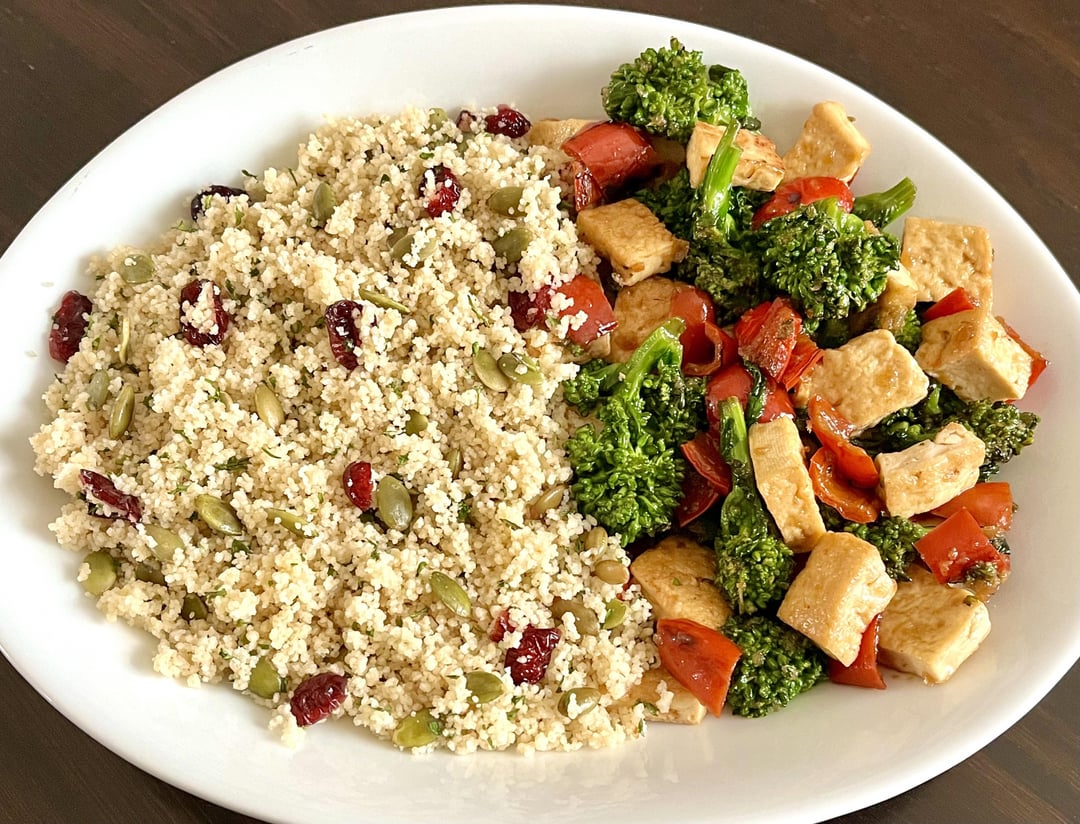 Herbed Couscous served with garlicky Tofu and sautéed veggies.