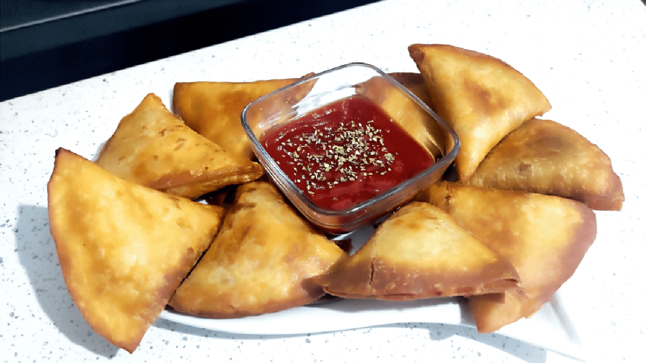 First, take fresh mushrooms, chop them finely, then fry them for 10 minutes, while frying the mushrooms, add salt and black pepper to taste. Then take Pizza ham and grate it, after we have finished grating the ham, we take mozzarella cheese and grate it in another plate. After we have finished grating, we take a large plate in which we put the cheese, ham, mushrooms and 7 tbsp of tomato sauce and 1 tbsp oregano. We start by mixing the ingredients, and mix well so that the ingredients can combine. After we have finished mixing, we are now making a mixture for sticking the tortilla. Put about 100 ml of water and 3-4 tablespoons of flour in a bowl and mix them. After we have finished mixing, take 6 tortillas and cut them in half. After we have cut the tortillas, we take one piece of tortilla and make it in the shape of a triangle, the procedure for forming a triangle is in the video, after we have made a triangle we fill it with the filling we made. And so we continue until we run out of tortillas and tortilla filling. The next step is frying, fry them for 2-3 minutes in olive oil.