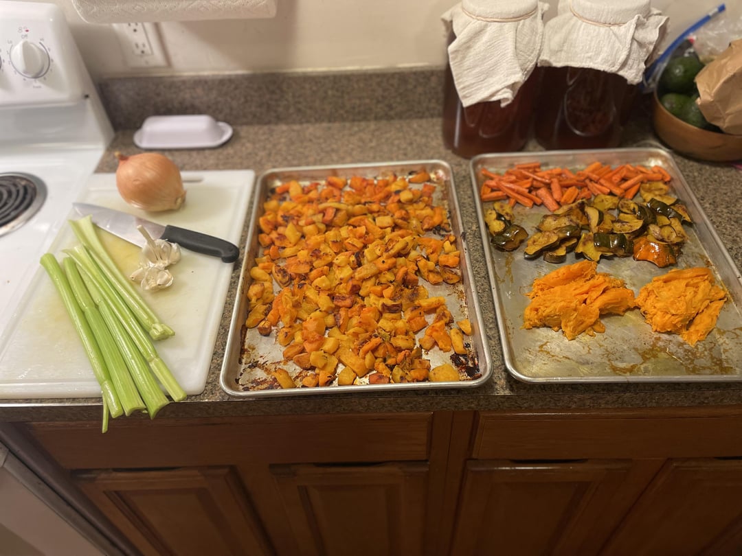 Cook the sweet potatoes in the oven wrapped in foil well to avoid sugars leaking out, at 425 this usually takes about 1 hour and 20 minutes in my experience ( after cooked, remove the potatoes’ skins and munch on them while you continue cooking : ] ). Carrots get treated much like the squash – cut them into reasonably consistent pieces, toss in olive oil, and roast those lovely orange vegetables until they become dark brown.