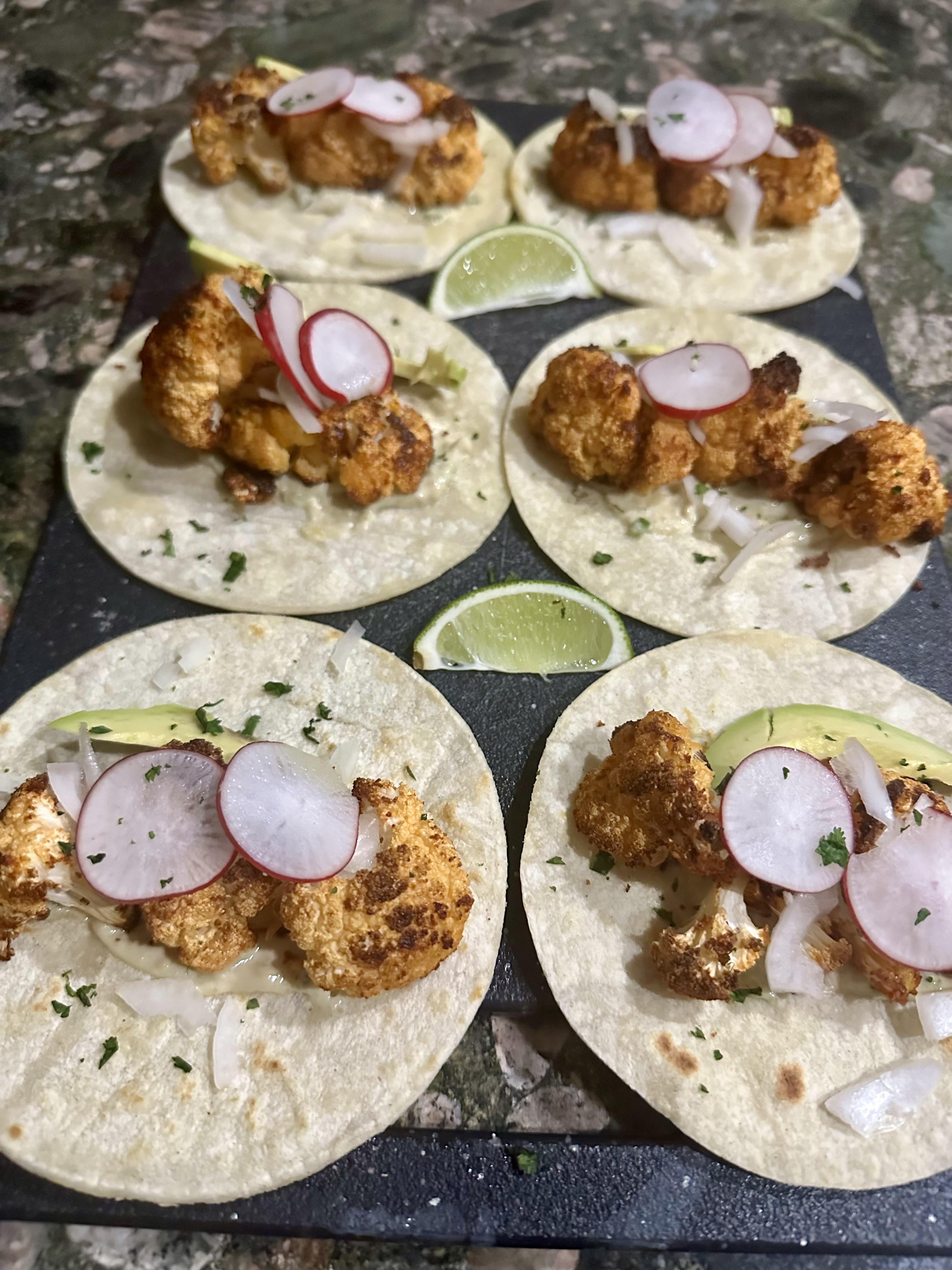 White corn tortillas topped with roasted cauliflower, avocado & radish with cashew cream. I halved the below recipe.