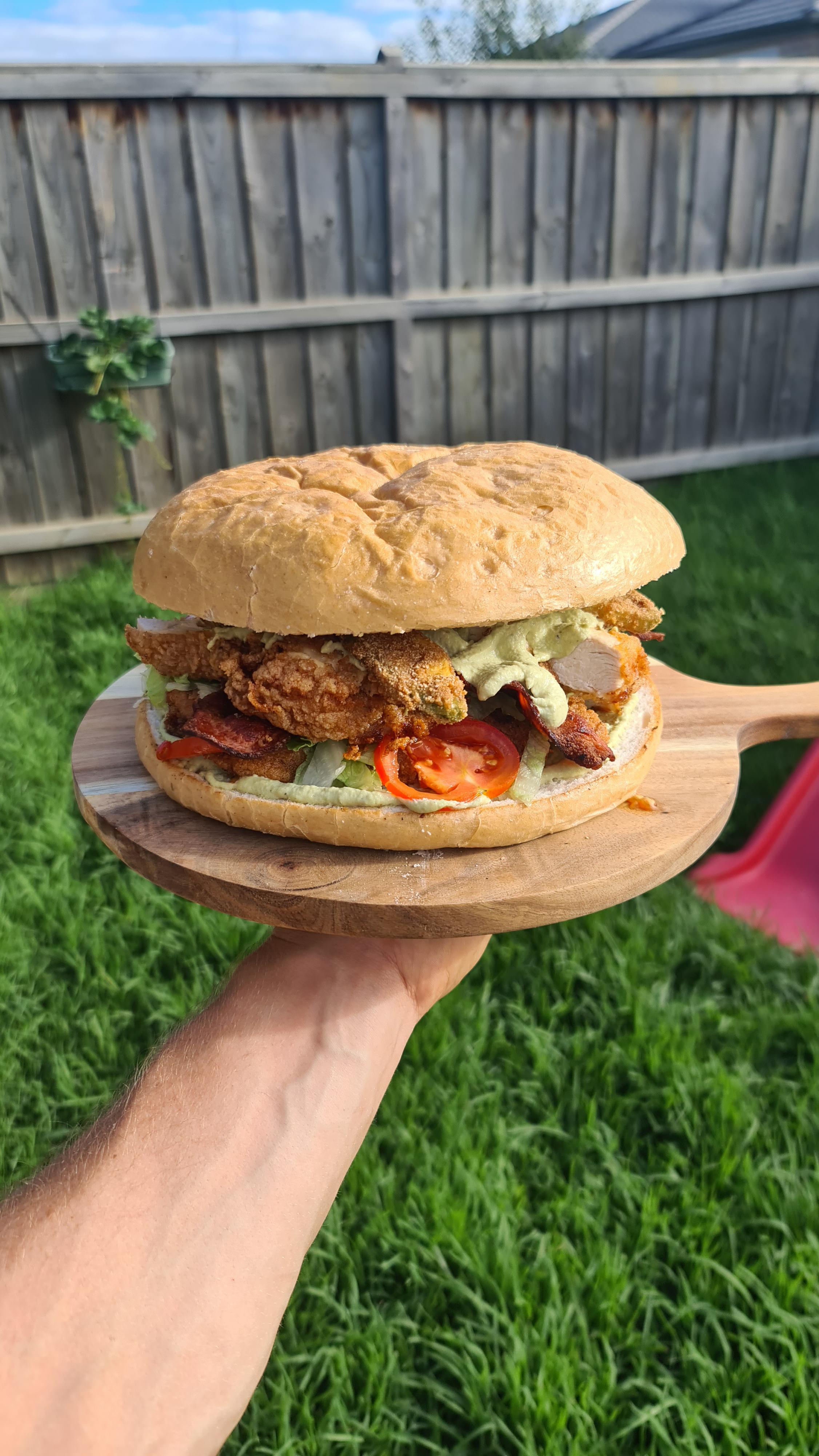12″ double fried chicken and bacon burger with avocado fries and jalapeño cashew cream sauce. Video and much more on IG: healthyheartattack by DiGiTizm Culinary Culinary Porn