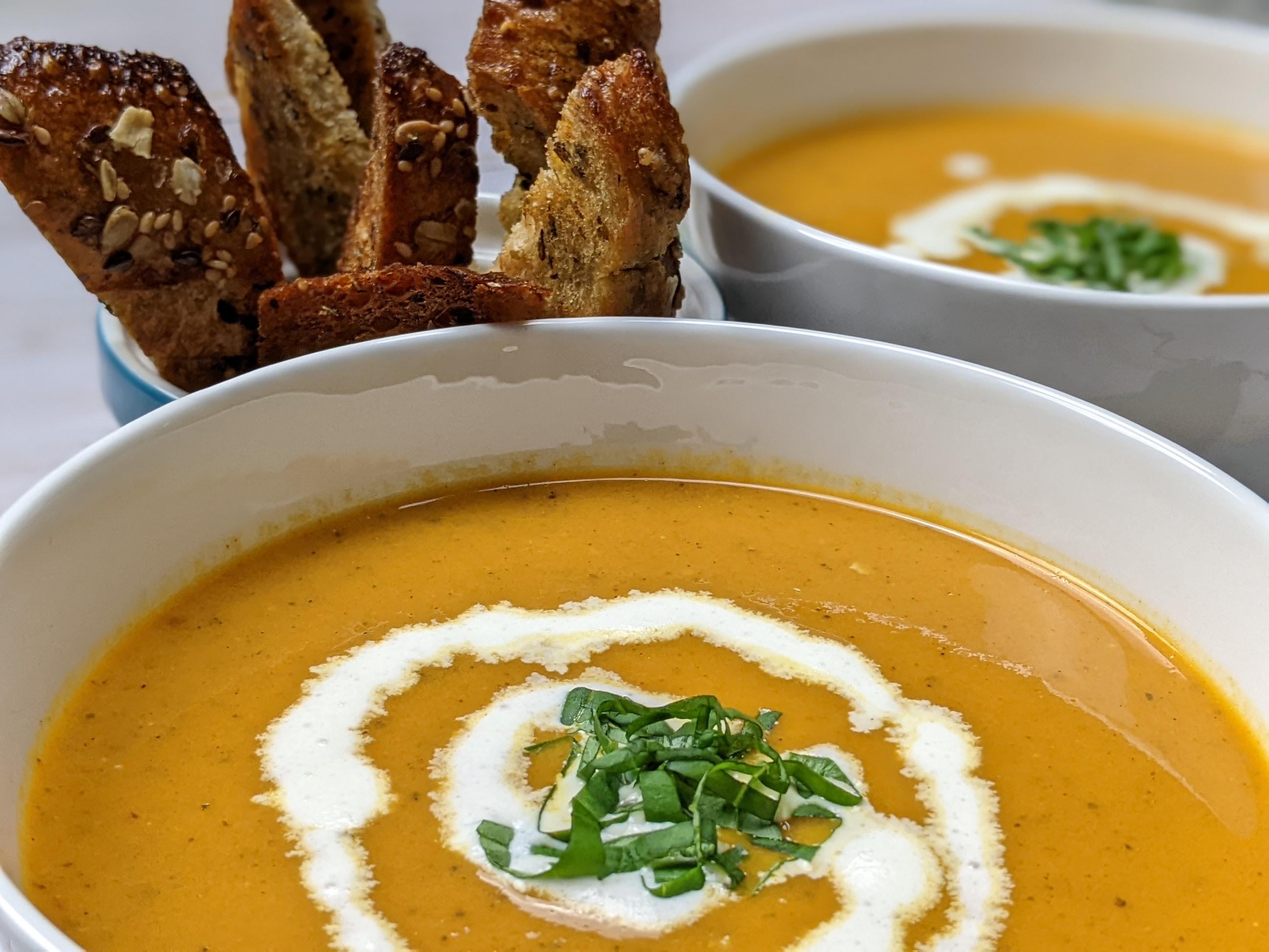 Roasted Tomato and Red Pepper Soup with homemade Crostini