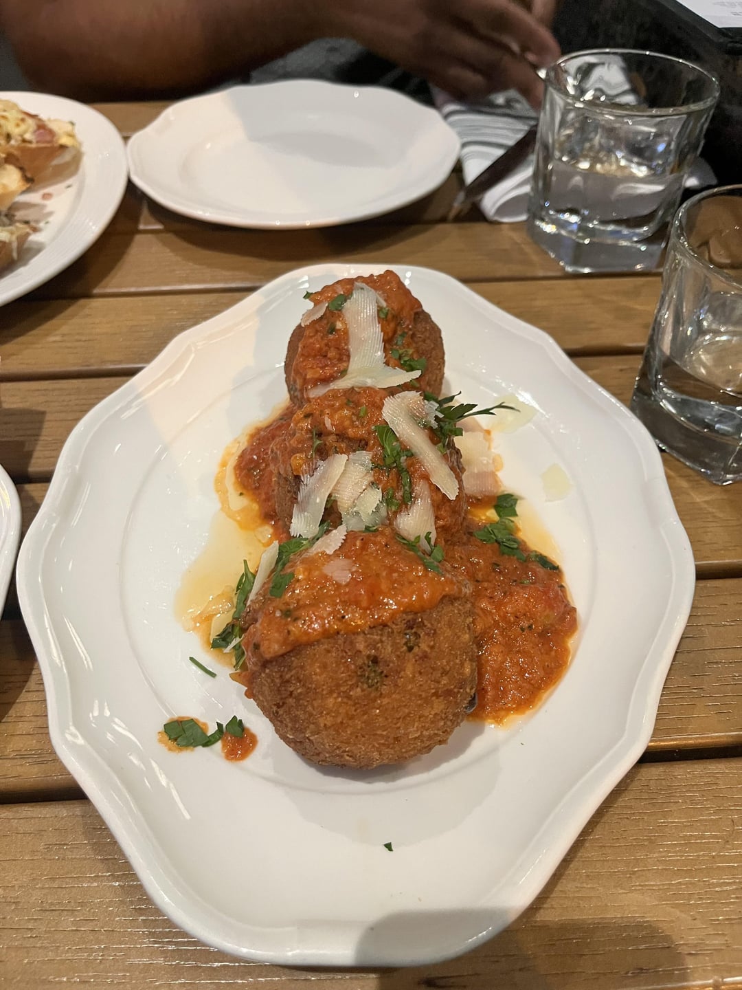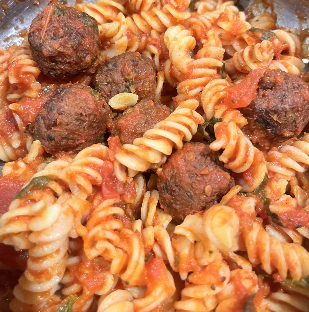 5) homemade fusilli and red sauce with meatless meatballs from Aldi