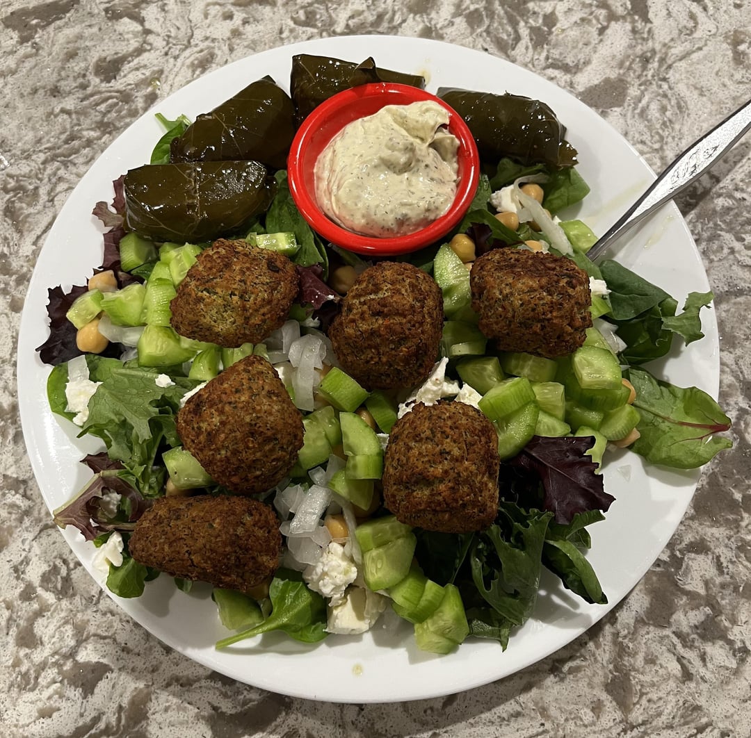 9)homemade greek salad with falafel and dolmas from Trader Joes