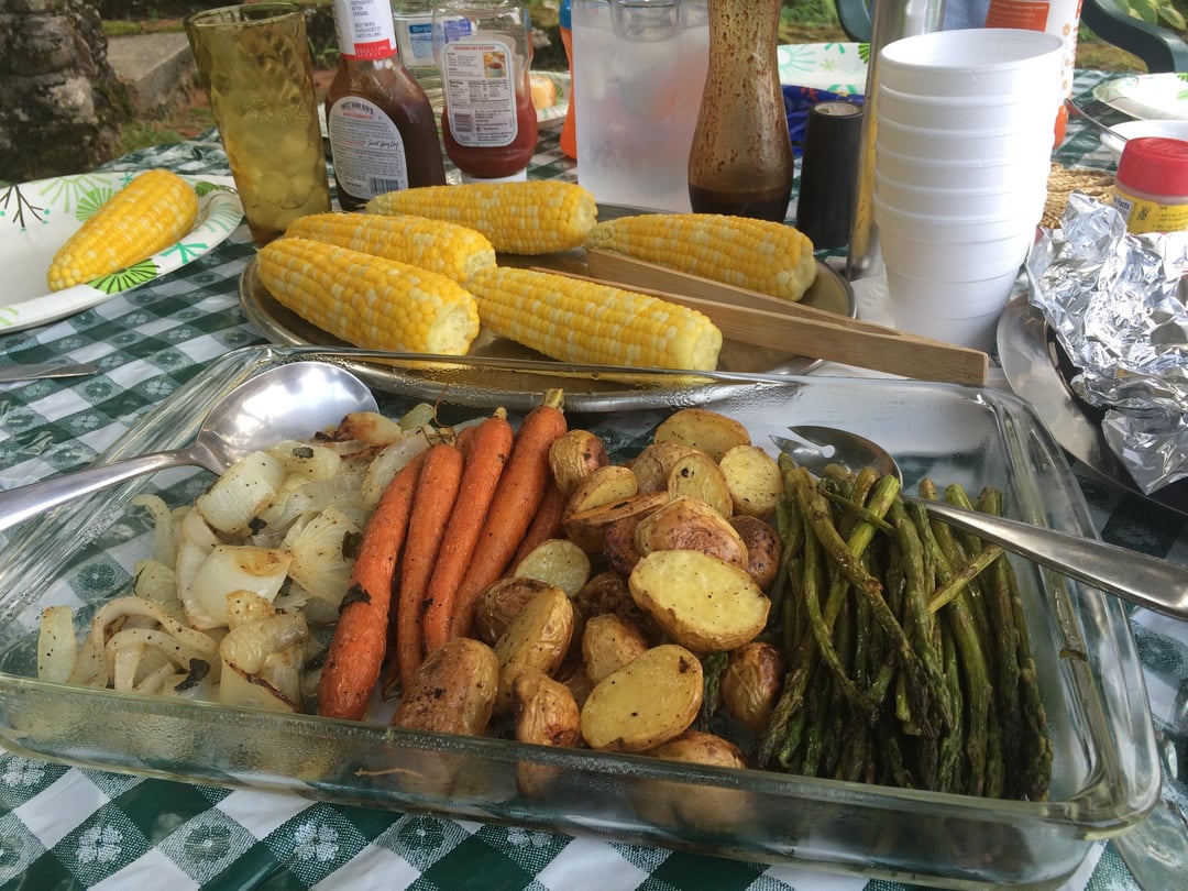 6) homemade roast broccoli and potatoes with meatless chick’n (looks like it was probably Gardein brand)