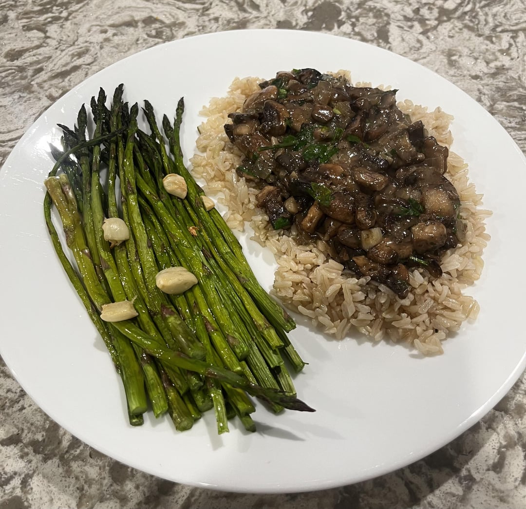 10)homemade “idk wtf to make for dinner” (sautéed mushrooms on brown rice with roasted asparagus)
